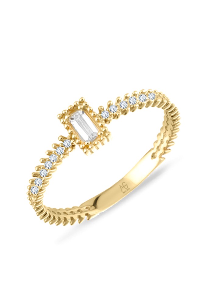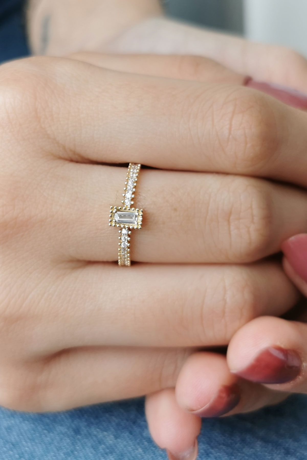 14 ayar sarı altın trend tasarımıyla günlük kullanıma uygun parmağınızda stilinize hava katacak 1.40 gram ağırlığında baget taşlı kolu taşlı minimal yüzük.