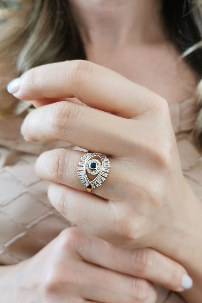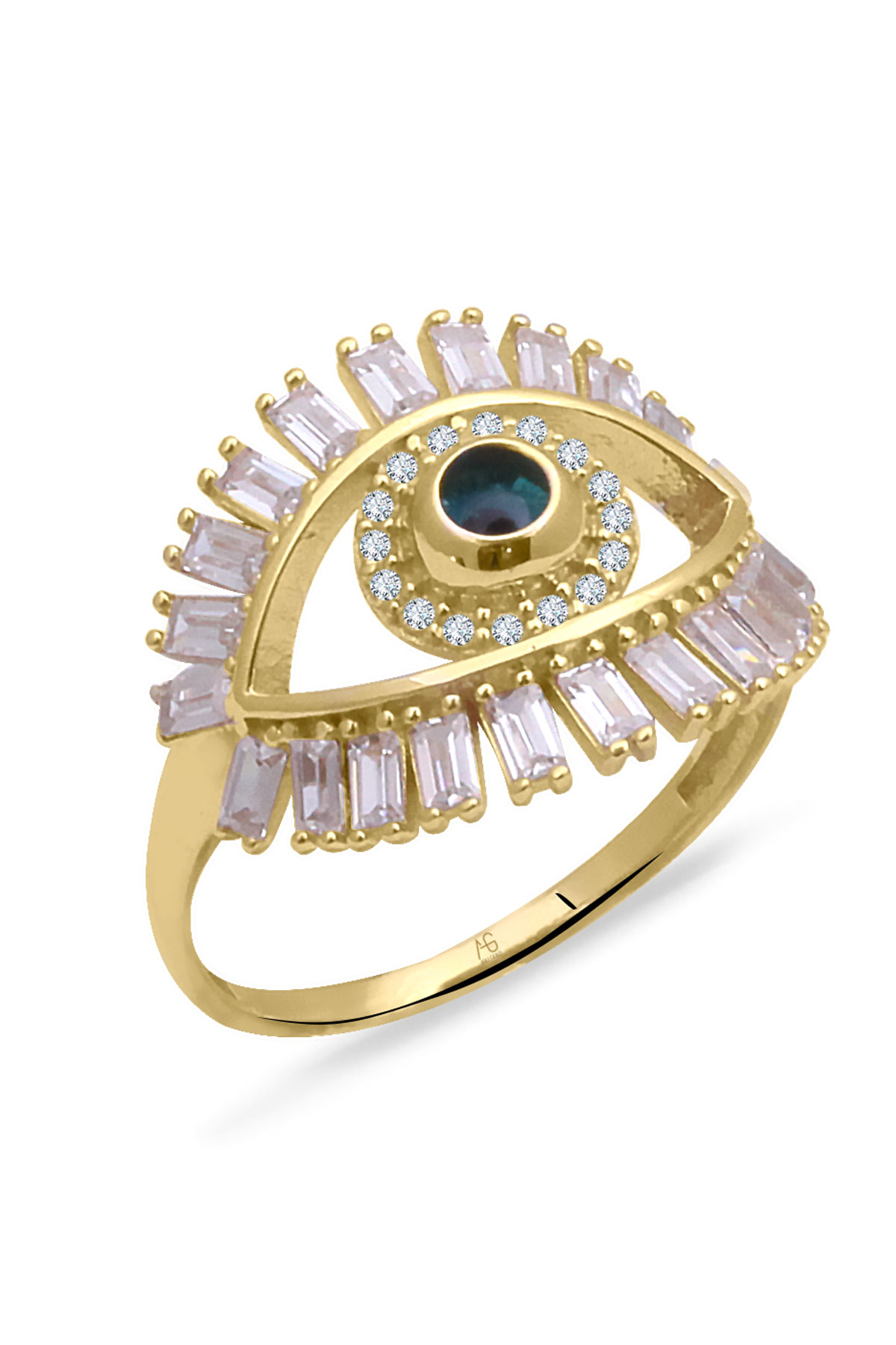 14 Ayar sarı altın kombinasyonlu göz kirpik tasarım detaylı günlük kullanıma uygun 2.90 gram ağırlığında baget taşlı modern kadın yüzük.