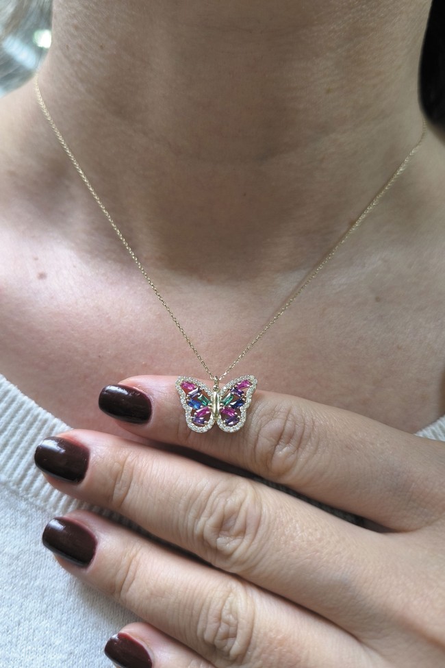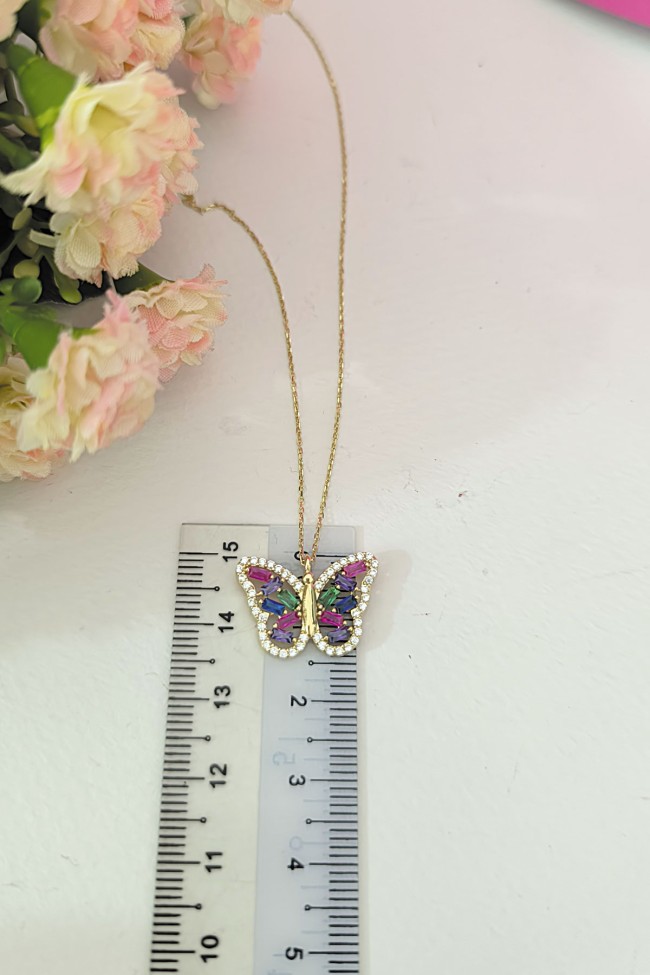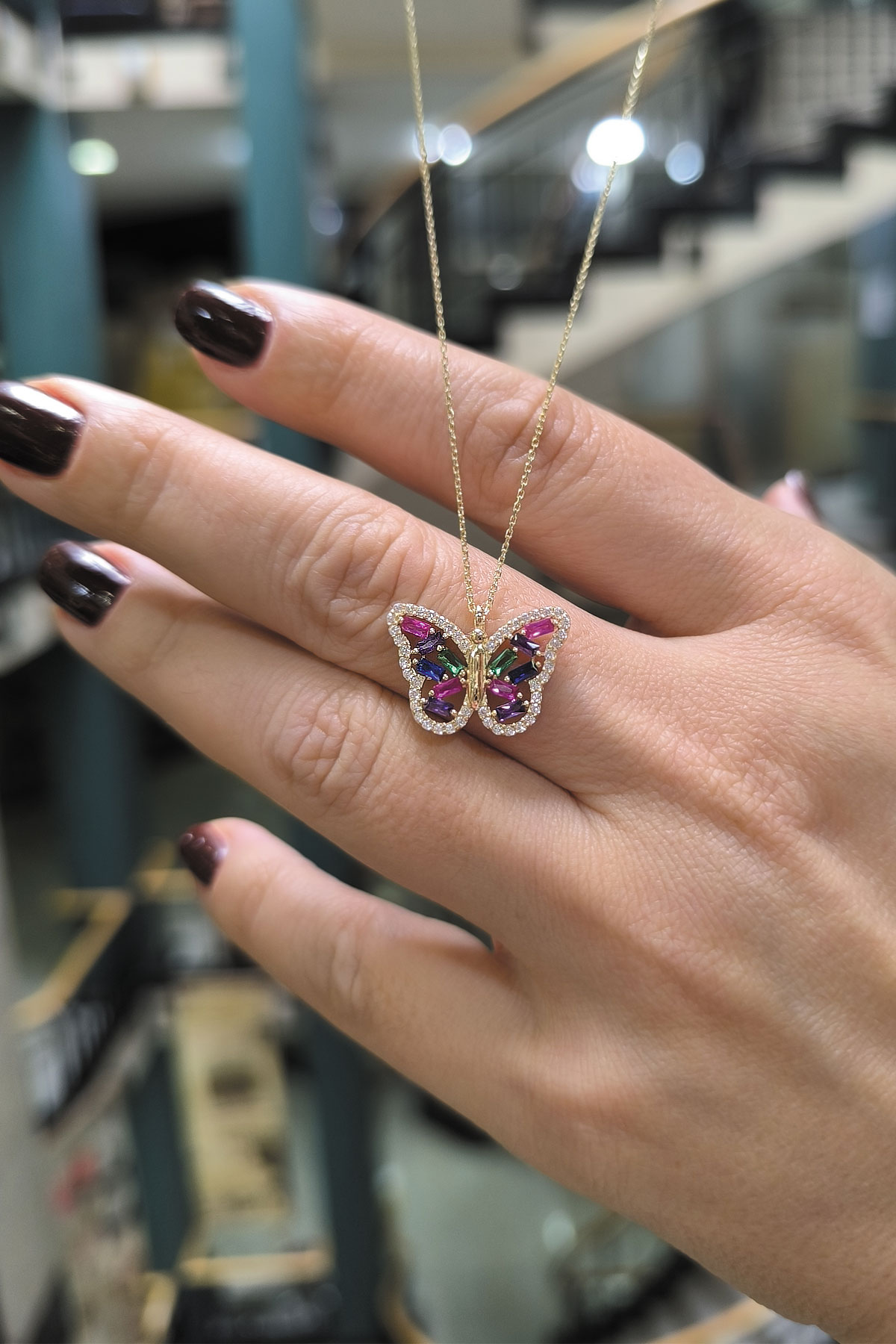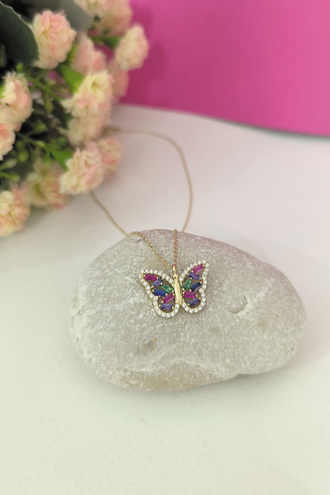 Renkli baget taşların enerji dolu kombinasyonu ile oldukça şık ve havalı bir duruşa sahip altın kelebek kolyeyle günlük stiline ışıltı katmaya hazır mısın? Tüm giyim kombinasyonlarınızla muhteşem uyum sağlayacak! Model boyutu 1.50 Cm'dir, 14 ayar altın kendinden zincirli kolyemiz 3.40 gram ağırlığındadır.