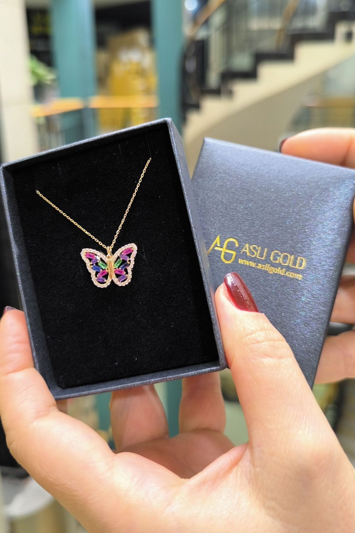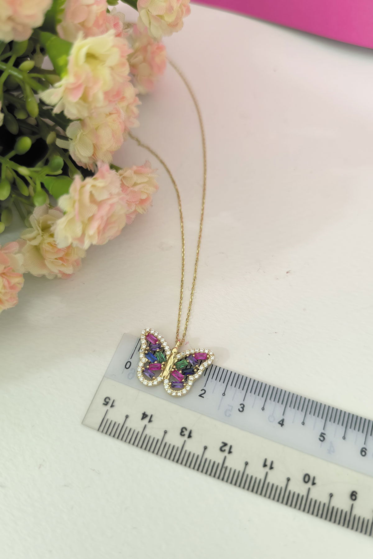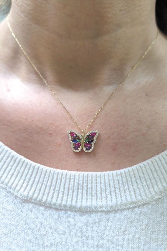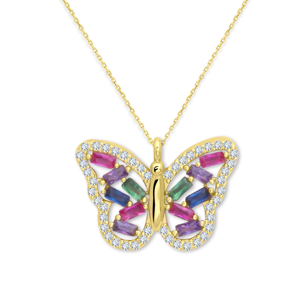 Renkli baget taşların enerji dolu kombinasyonu ile oldukça şık ve havalı bir duruşa sahip altın kelebek kolyeyle günlük stiline ışıltı katmaya hazır mısın? Tüm giyim kombinasyonlarınızla muhteşem uyum sağlayacak! Model boyutu 1.50 Cm'dir, 14 ayar altın kendinden zincirli kolyemiz 3.40 gram ağırlığındadır.