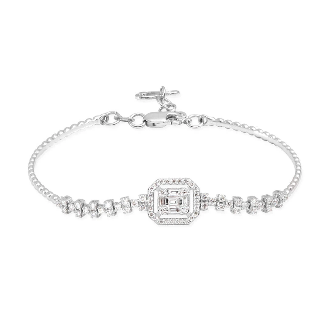 Sade ve zarif 14 ayar beyaz altın 0.66 ct. F/VS kesim pırlantalı baget taş detayı ile ışıltısına minimal detaylar ile dokunuşlar yapılmış günlük olarak da kullanabileceğiniz ışıl ışıl modern tasarım bileklik.