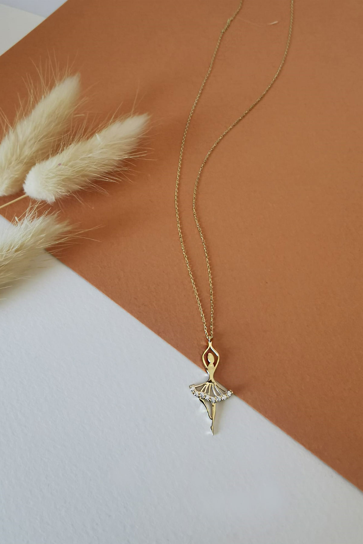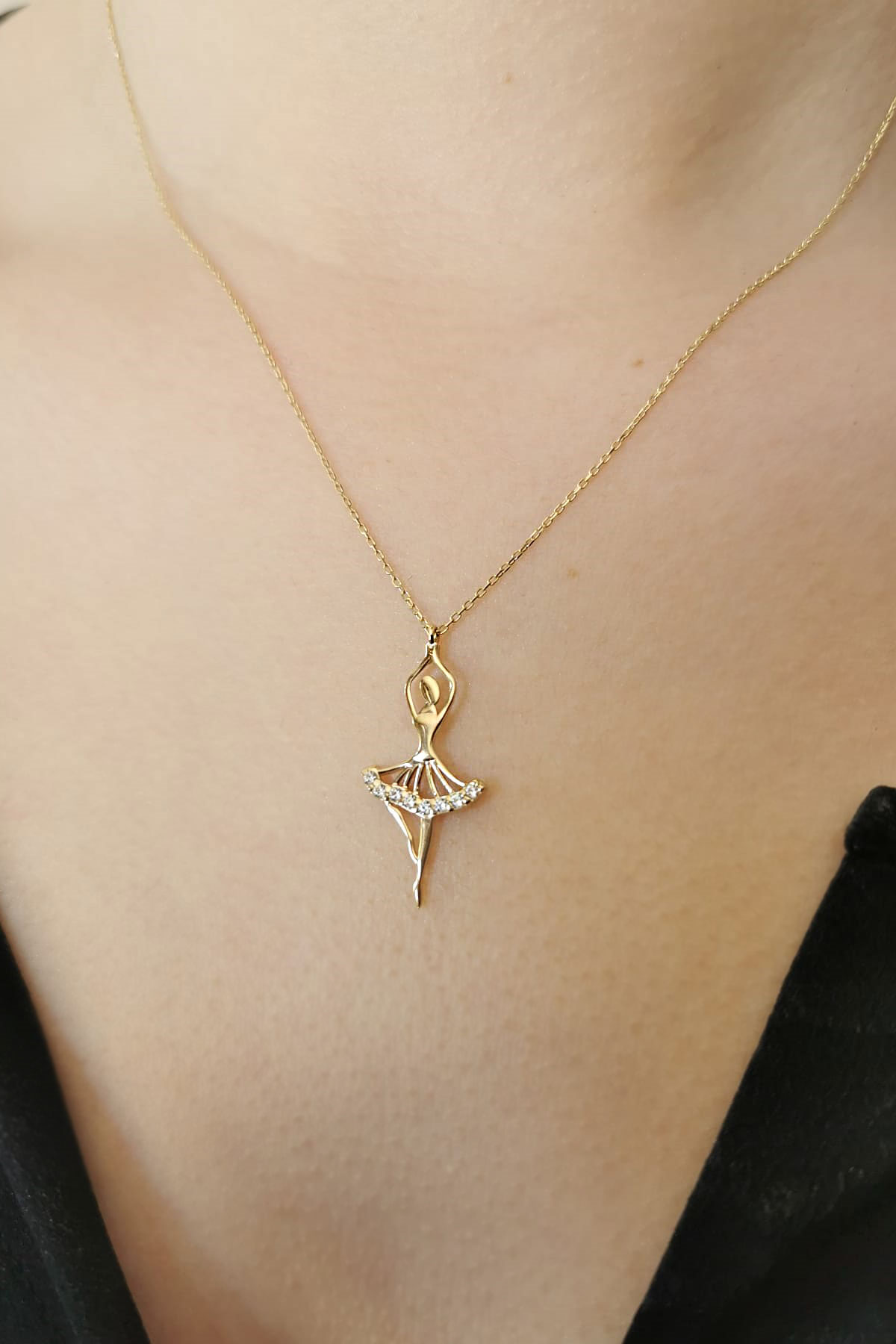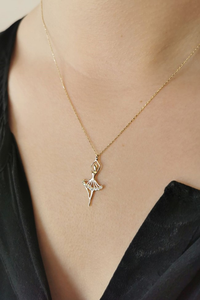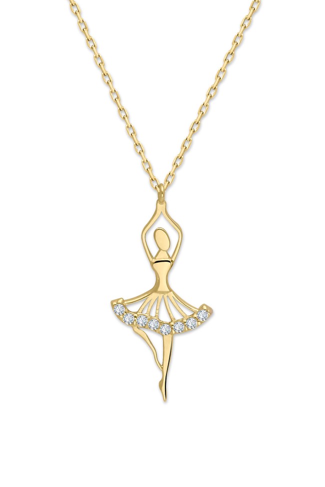 2.7 Cm Boyunda Kendinden 45 Cm Zincirli 14 Ayar Zirkon Taşlı Minimal Zarif Tasarıma Sahip Işıl Işıl Günlük Kullanıma Uygun 1.75 Gr. Ağırlığında Altın Balerin Kız Kolye.
