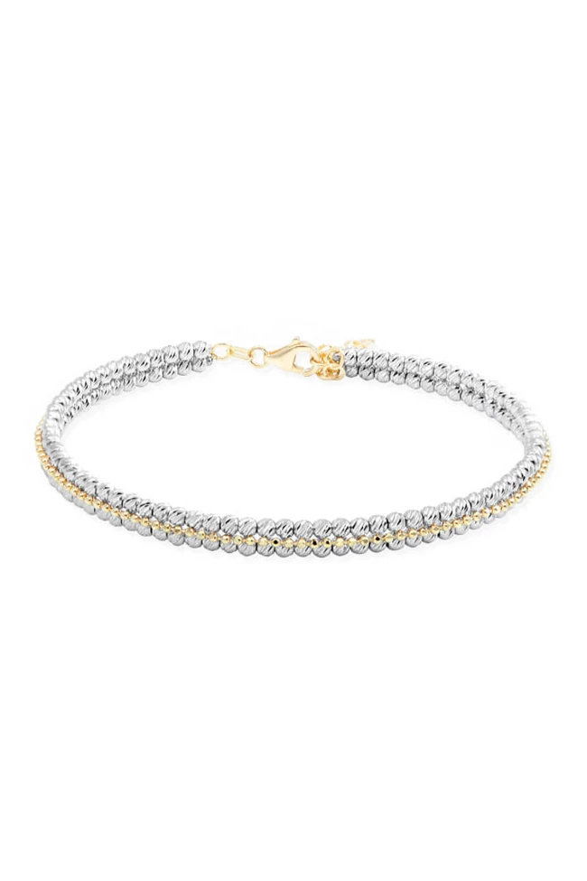 14 Ayar beyaz altın ağırlıklı dorika toplarla tasarlanmış orta kısmından çakı sarı altın zincir detayı geçen Elenor dorika bilezik. İster saatlerinizle kombine kullanın ister sağ bileğinizde tek olarak stilinizi yansıtsın!