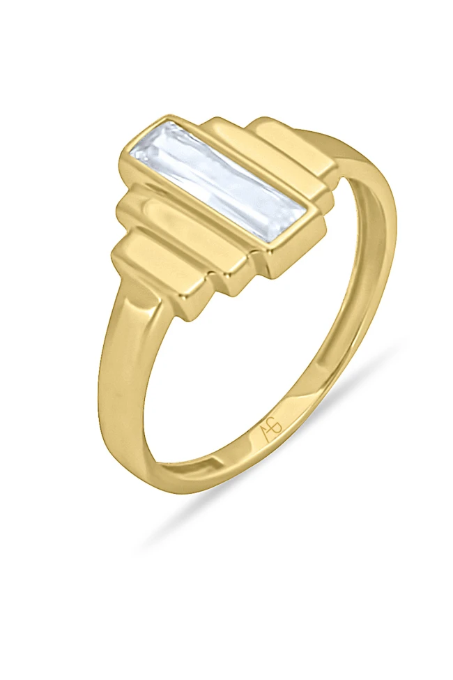 Sade model beyaz baget taşlı 14 ayar sarı altın tasarımıyla günlük kullanıma uygun 2.50 gram ağırlığında modern ve tarz kadın yüzük.