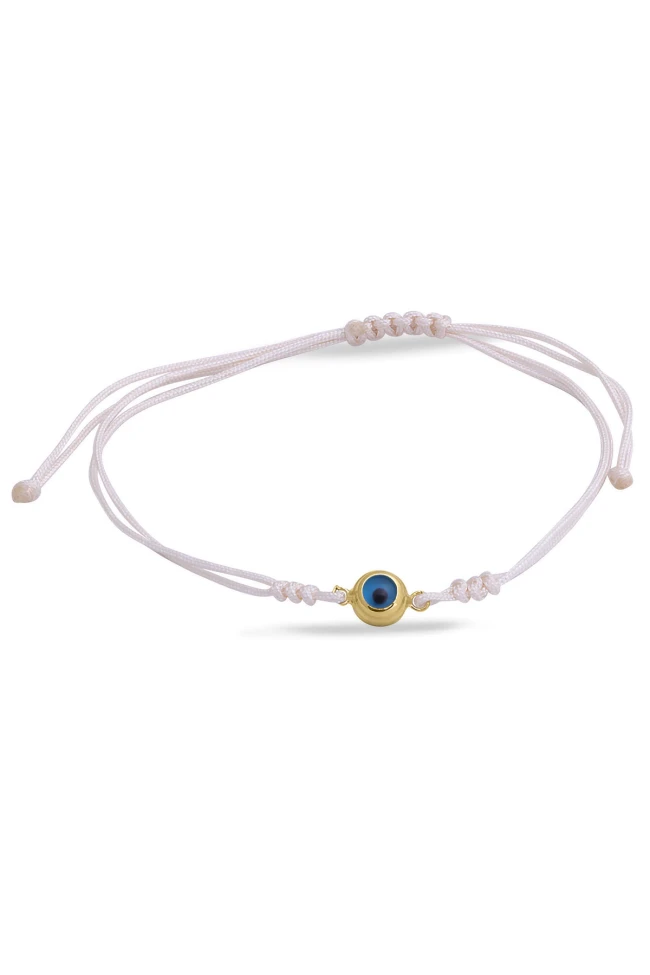 Beyaz ip tasarımı ile günlük olarak saatlerinizle yada tek olarak kullanabileceğiniz sevdiklerinize doğum günü hediyesi olarak da armağan edebileceğiniz 14 ayar 0.50 gr ağırlığında 14 ayar altın nazar bileklik.