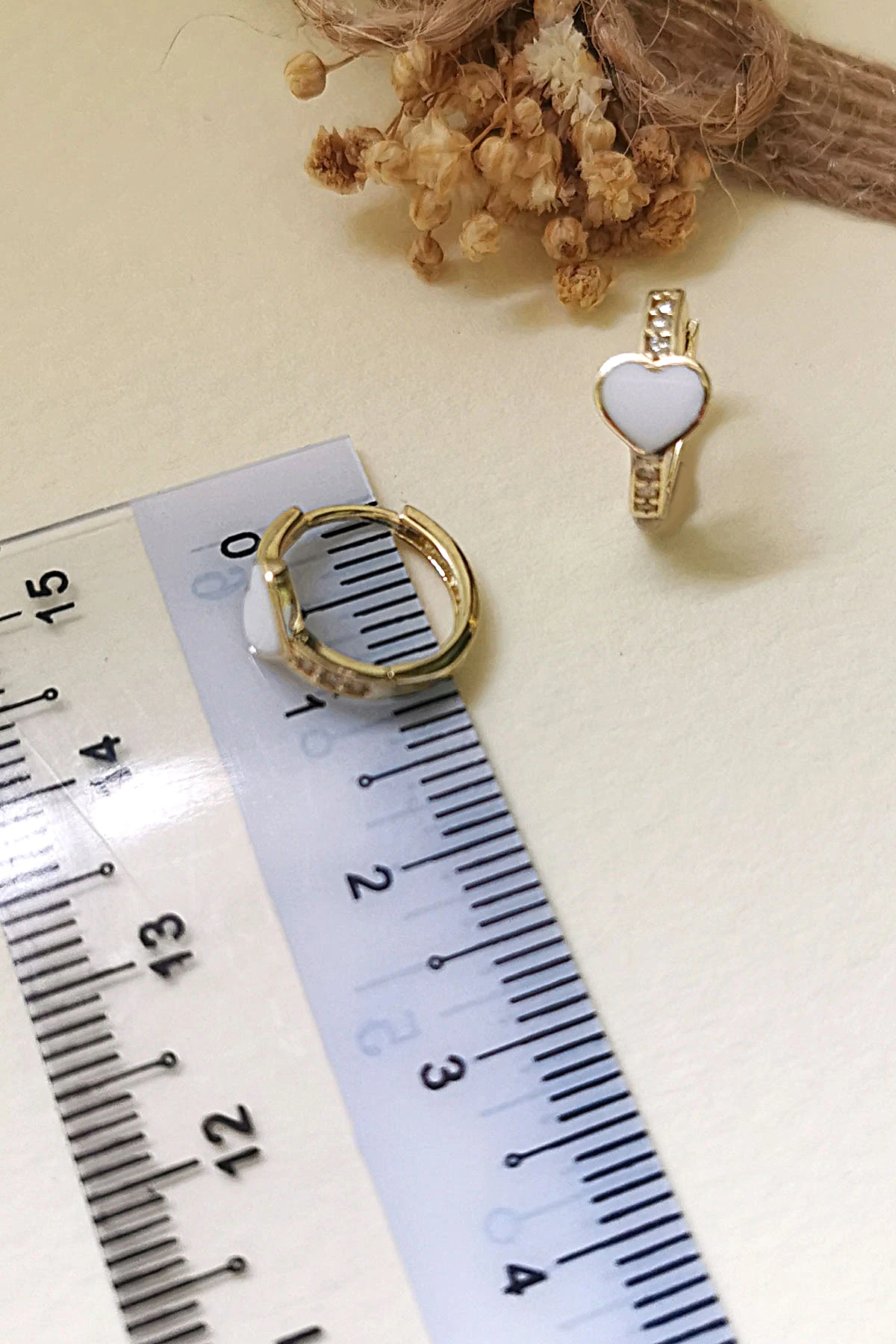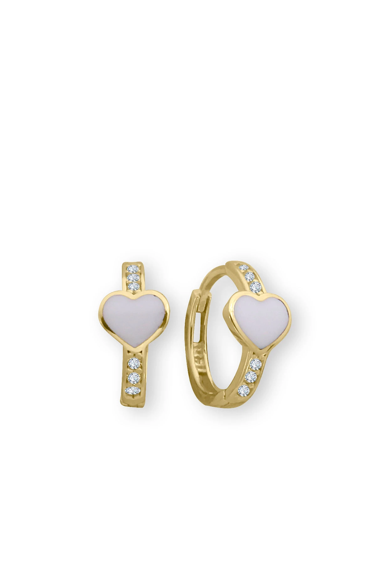 1.2 Cm boyunda beyaz mineli kalp model günlük olarak kullanıma uygun 14 ayar 1.30 gr ağırlığında altın çocuk küpesi.