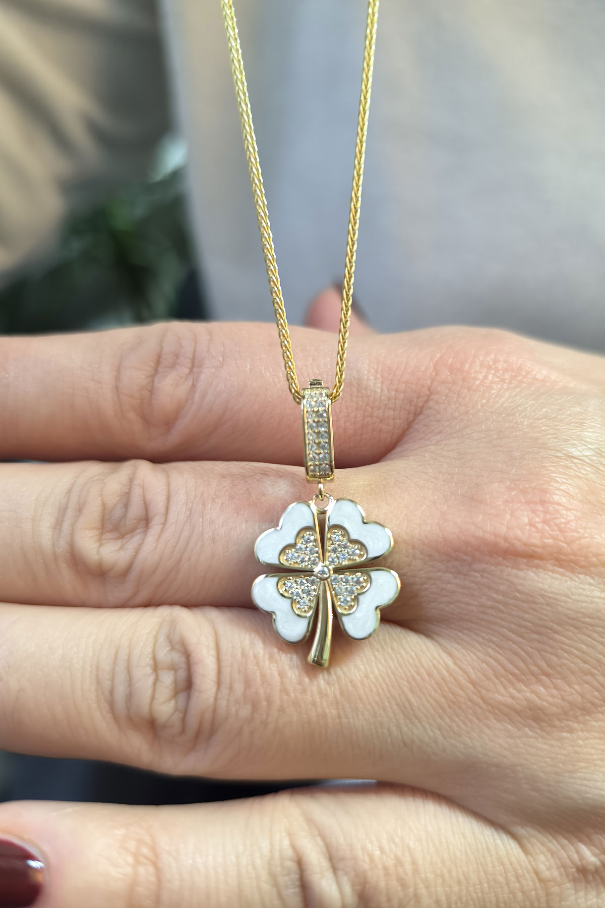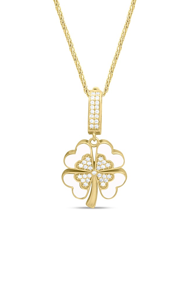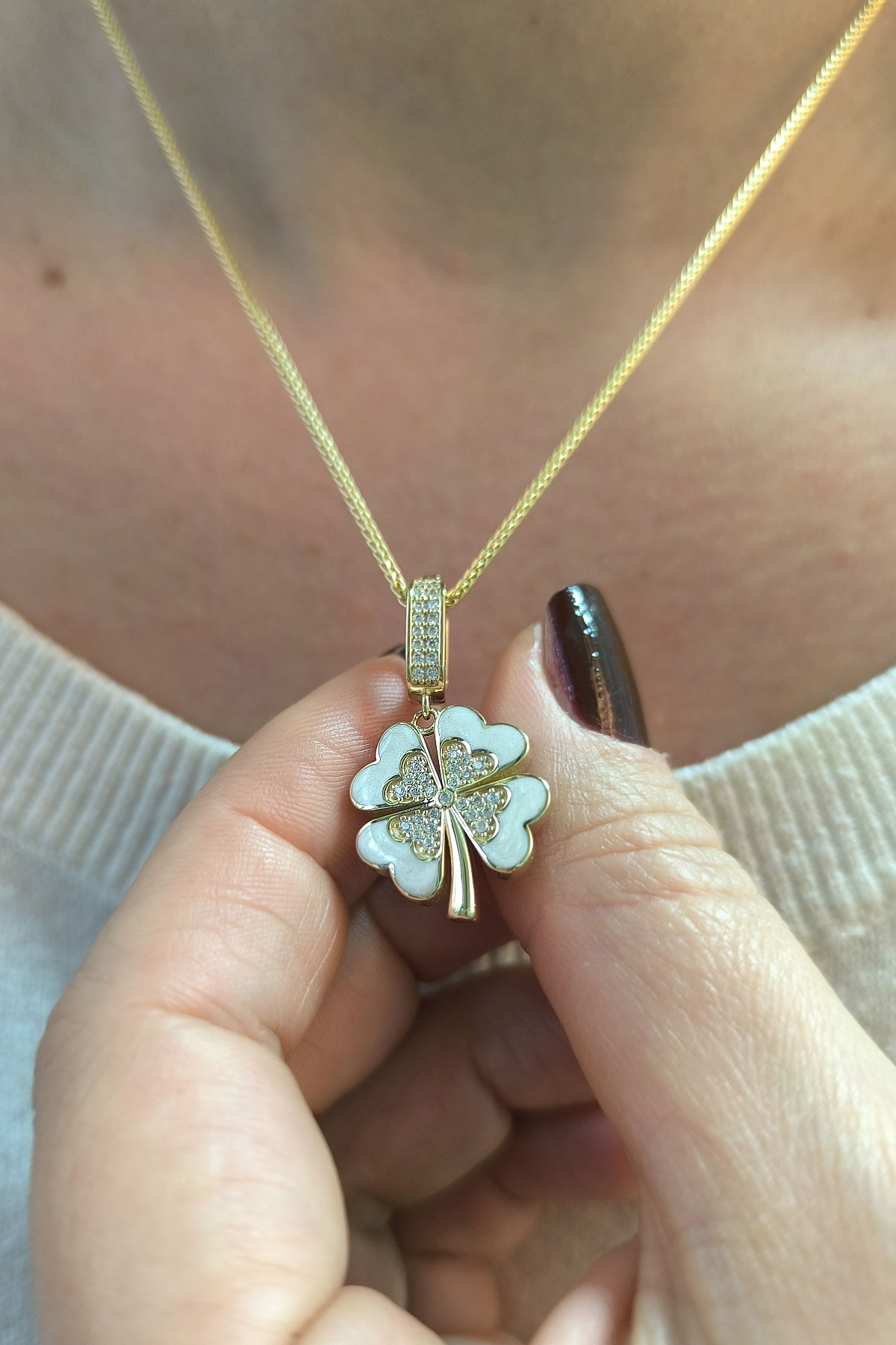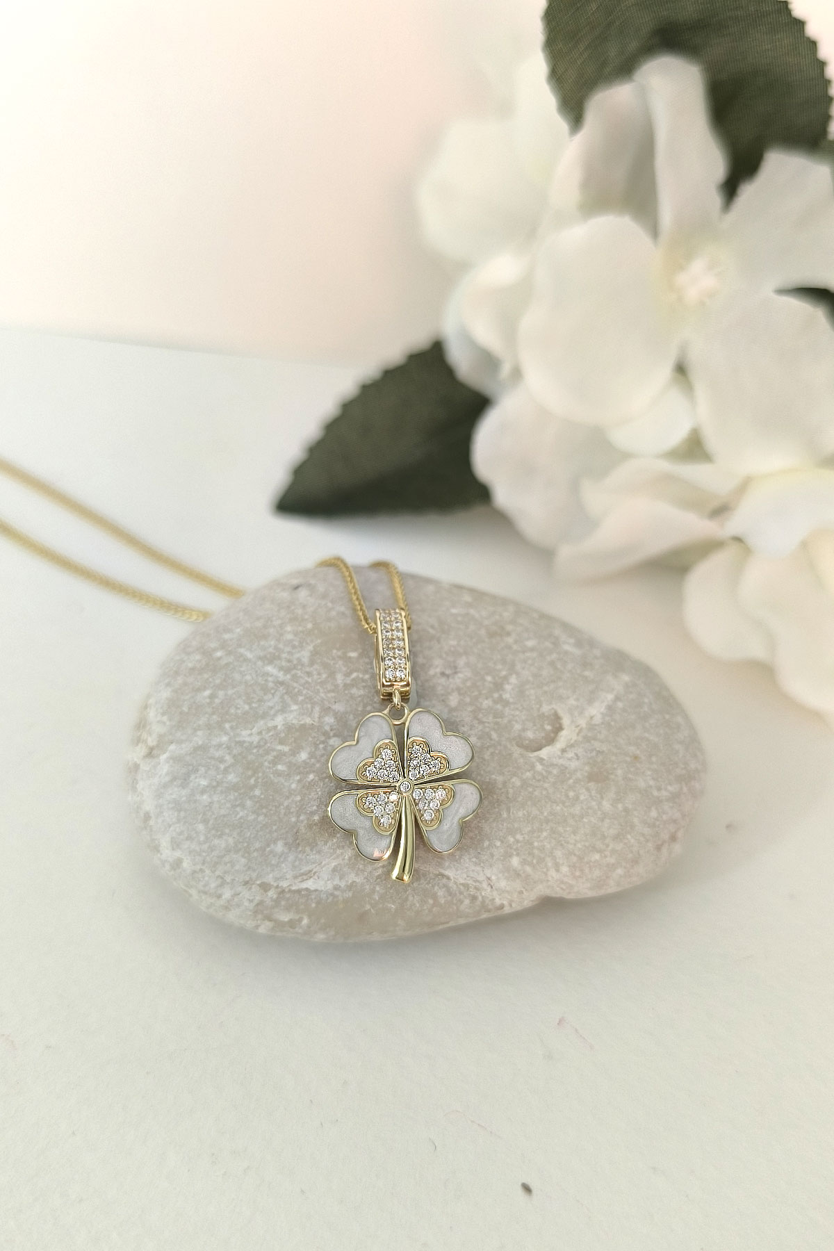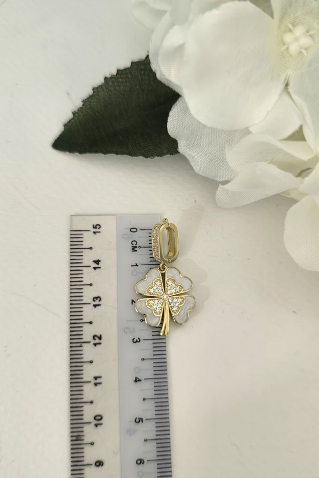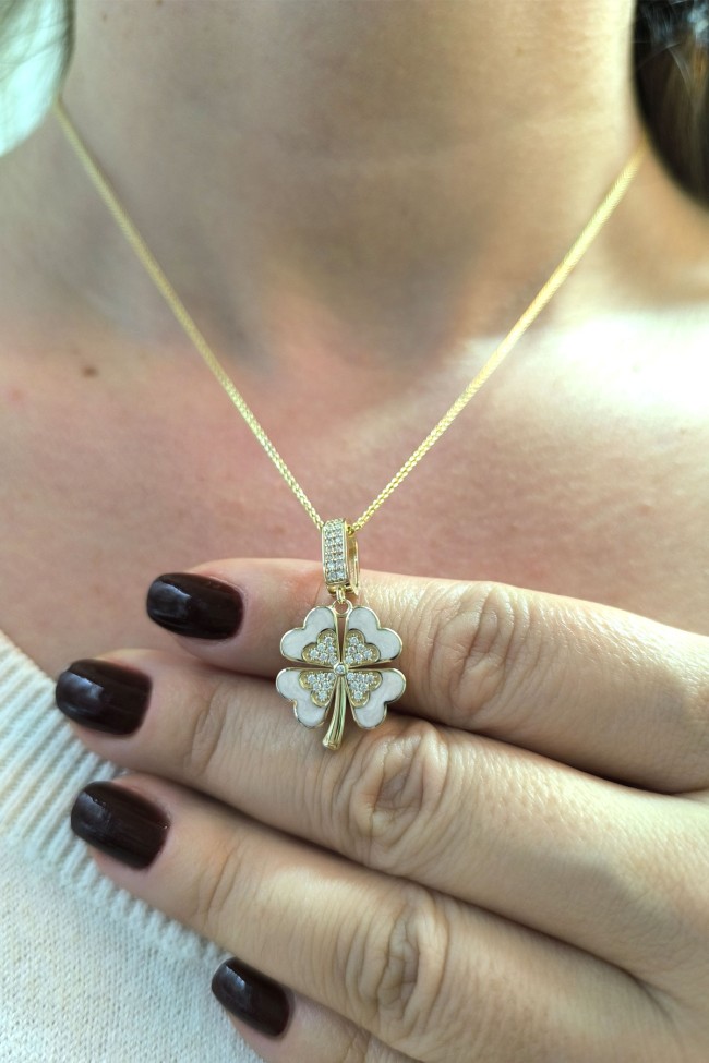 5.30 gr. 3 cm boyutunda zirkon taşlı model 14 ayar altın beyaz sedef mineli yonca model charm kilit kolye. Farklı kolyelerinizle bir arada kombine olarak kullanabileceğiniz harika ve gösterişli bir model.