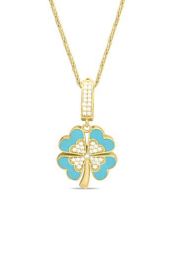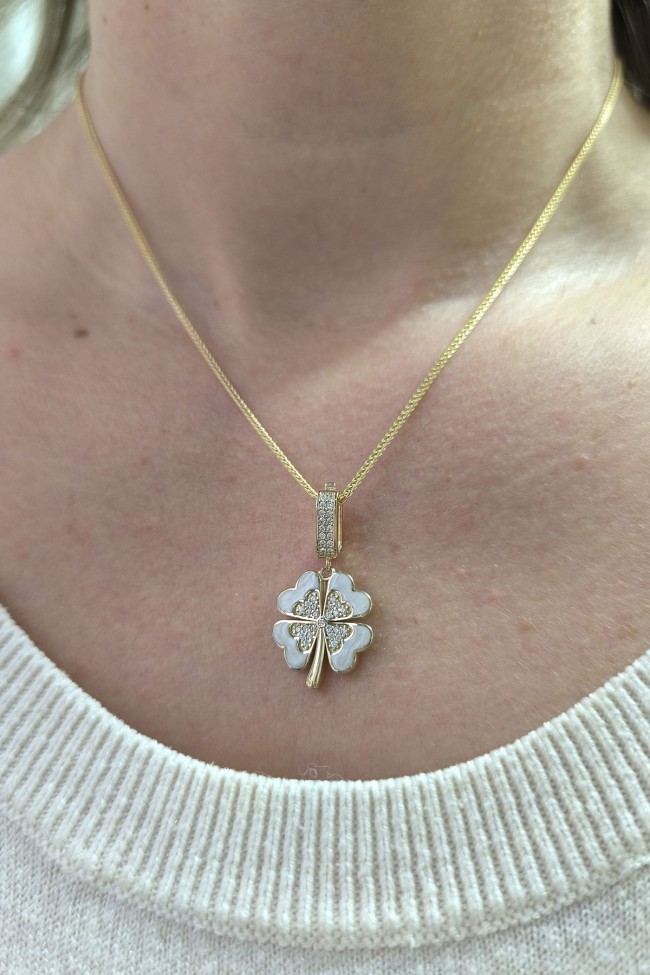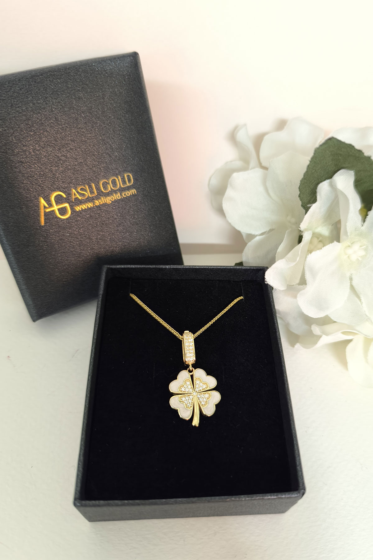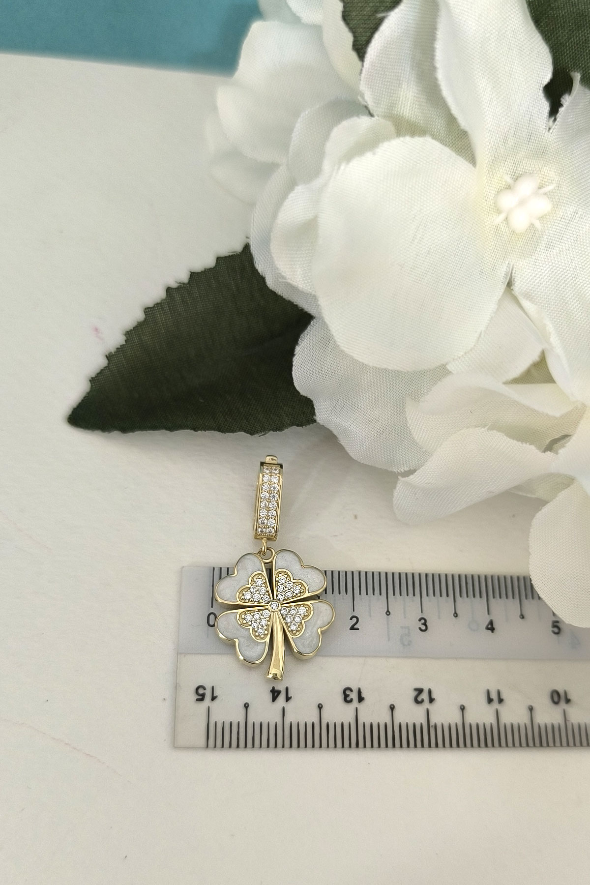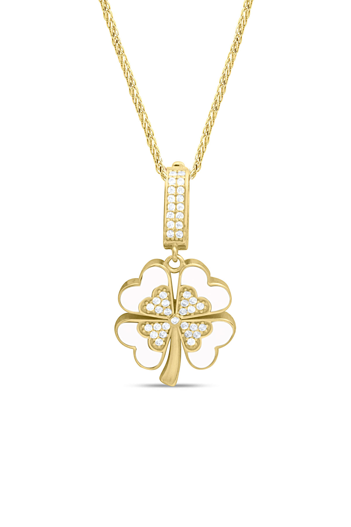 5.30 gr. 3 cm boyutunda zirkon taşlı model 14 ayar altın beyaz sedef mineli yonca model charm kilit kolye. Farklı kolyelerinizle bir arada kombine olarak kullanabileceğiniz harika ve gösterişli bir model.
