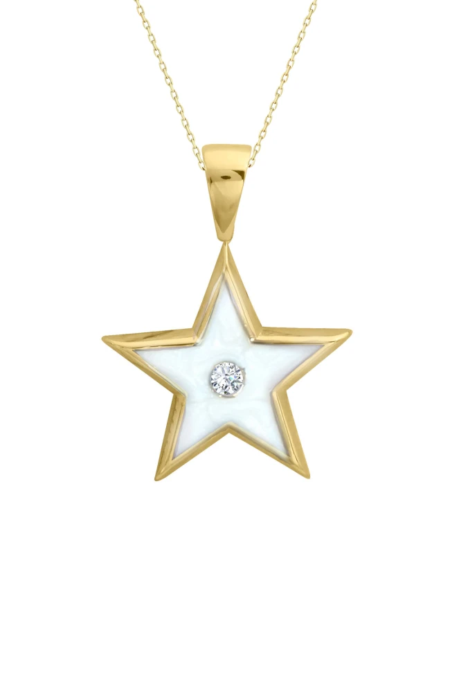 14 Ayar altın 4.60 gram ağırlığında şık ve gündelik kullanıma uygun taş detaylı beyaz mineli 3 cm boyunda yıldız altın kolye.