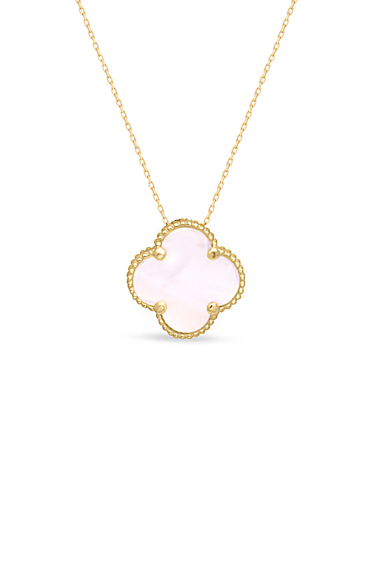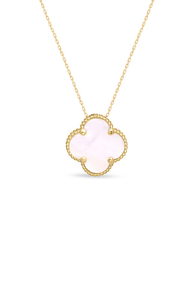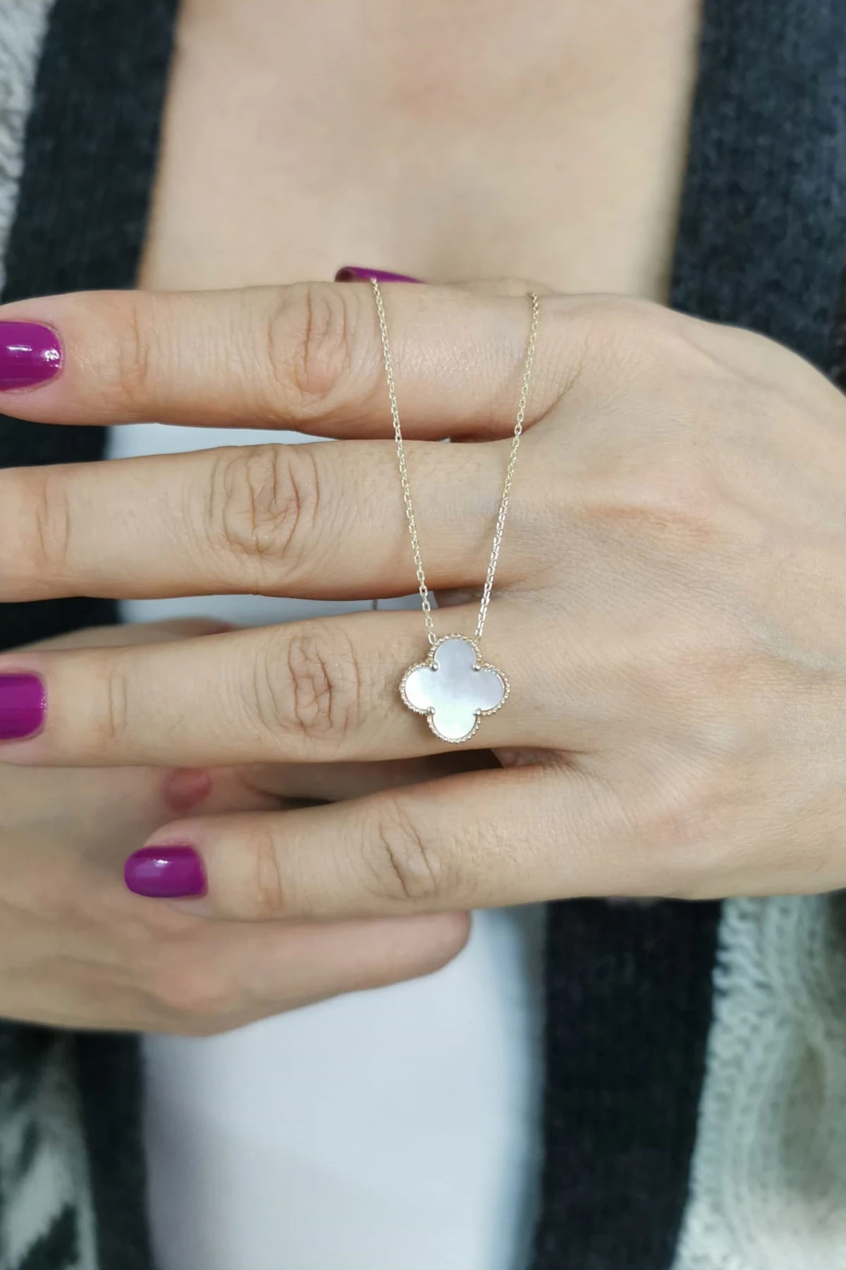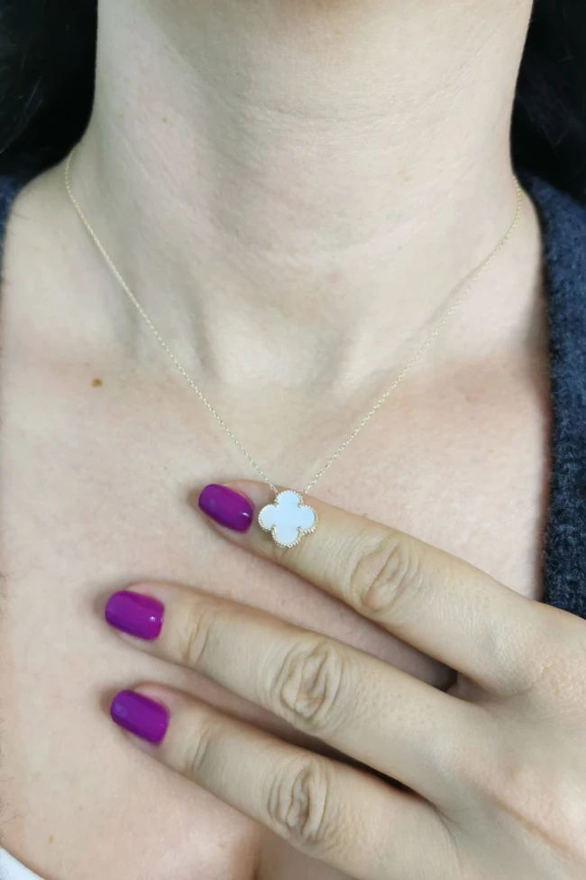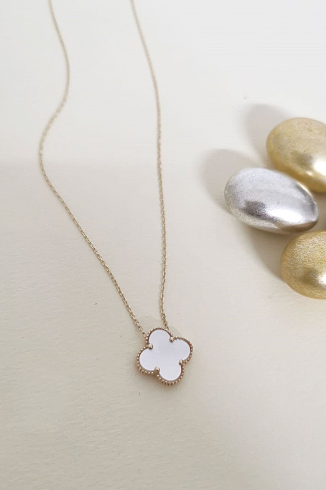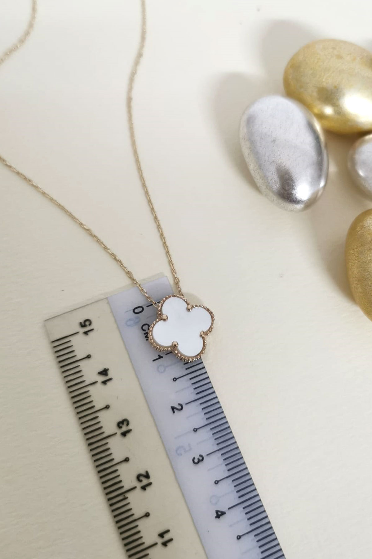 2.50 Gram Ağırlığında 45 Cm Yonca 1.2 Cm Beyaz Sedef Taşlı Günlük Ve Zarif Bir Duruşa Sahip Şık Bir Tarzı Olan 14 Ayar Altın Tasarım Kolye.