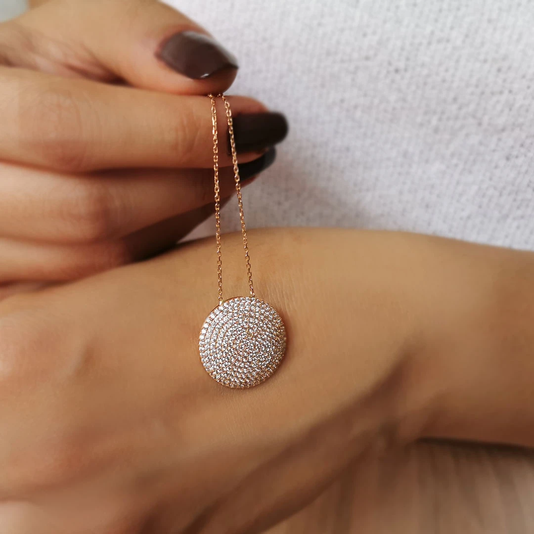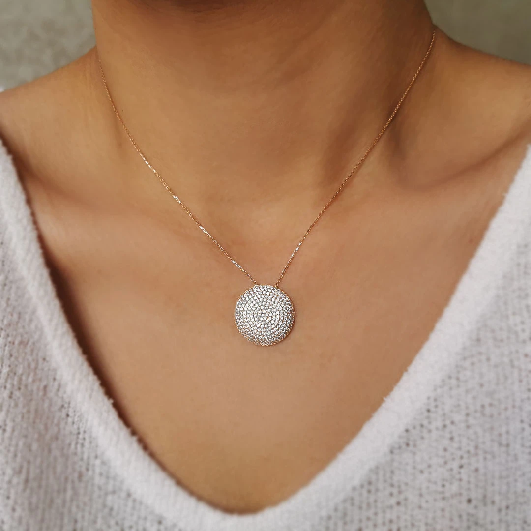 45 Cm zincirli 4.15 gr. 1,8 cm boyutunda yuvarlak bombe formlu çok taşlı model 14 ayar altın spor kolye.