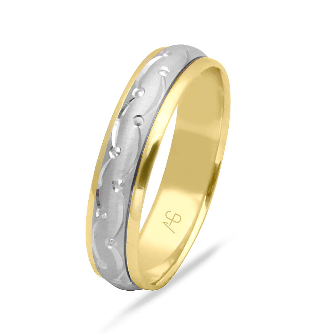 14 Ayar sarı-beyaz şık duruşa sahip günlük kullanıma uygun orta kısmı bombeli 3.40 gram ağırlığında taşsız hem kadın hem erkek kullanımına uygun altın alyans yüzük.