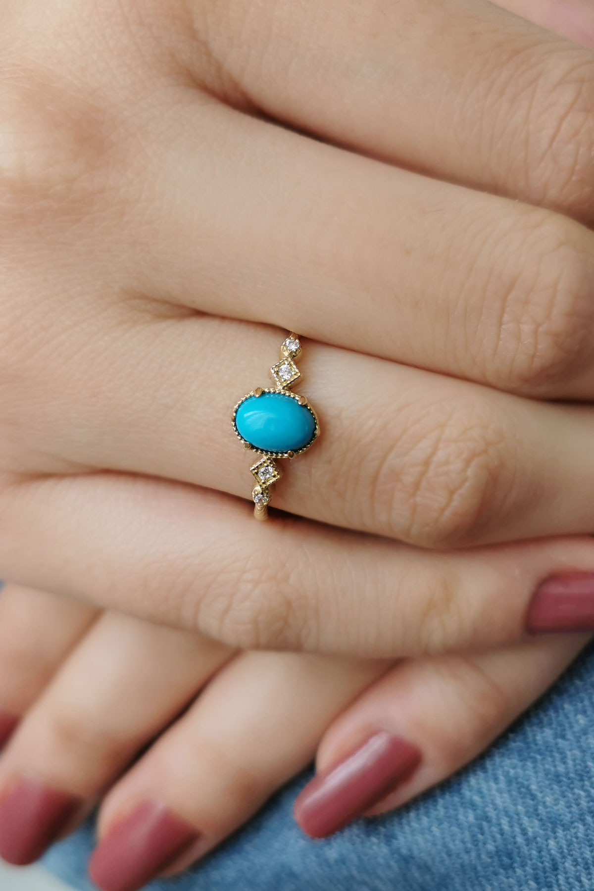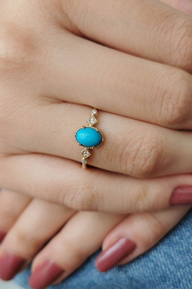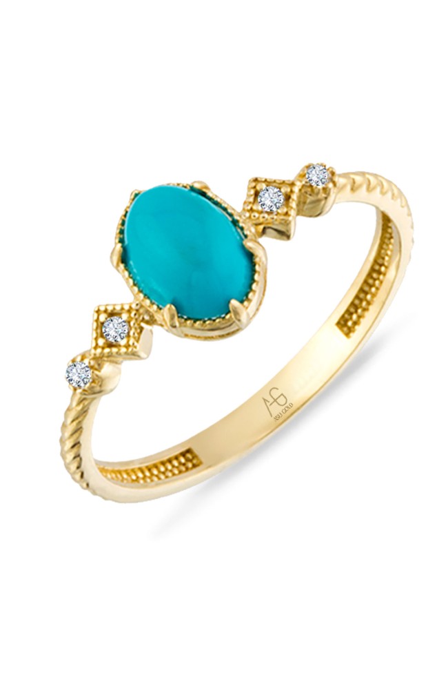 14 Ayar sarı altın firuze damla taşlı burgu kol tasarımıyla günlük kullanıma uygun 1.60 gram ağırlığında minimal kadın yüzük.