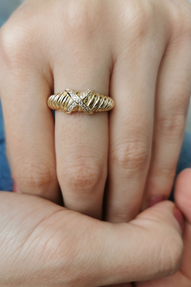 Sezonun modası az taşlı çapraz 14 ayar sarı altın tasarımıyla günlük kullanıma uygun 3.60 gram ağırlığında modern ve tarz midye kadın yüzük.