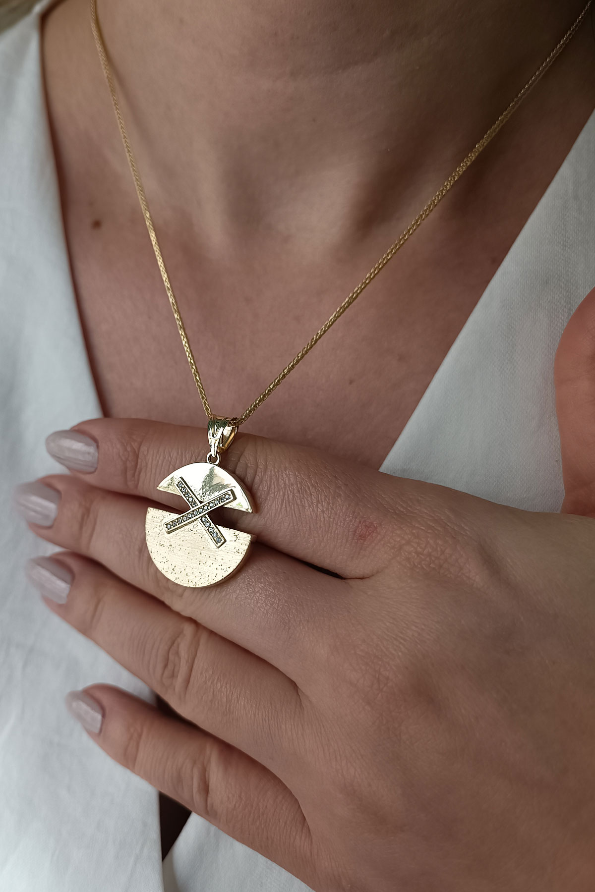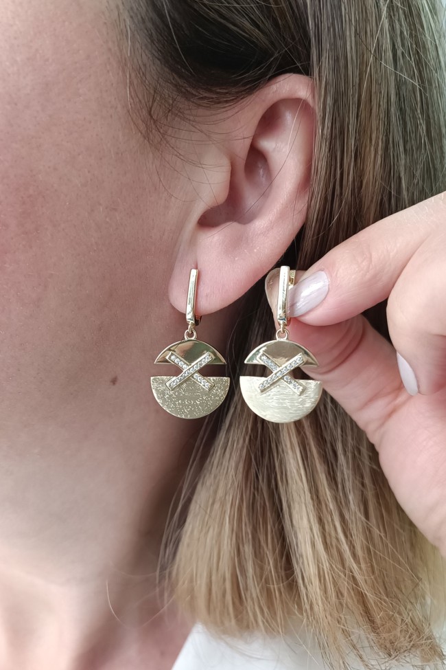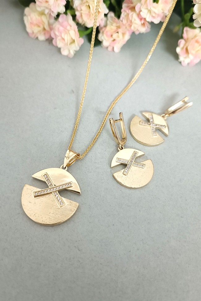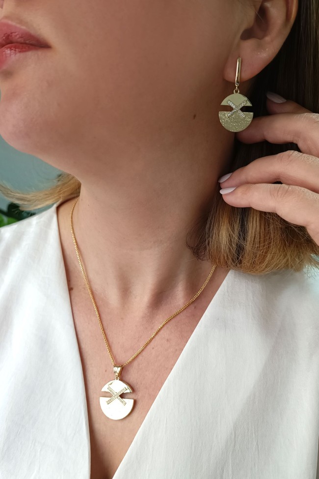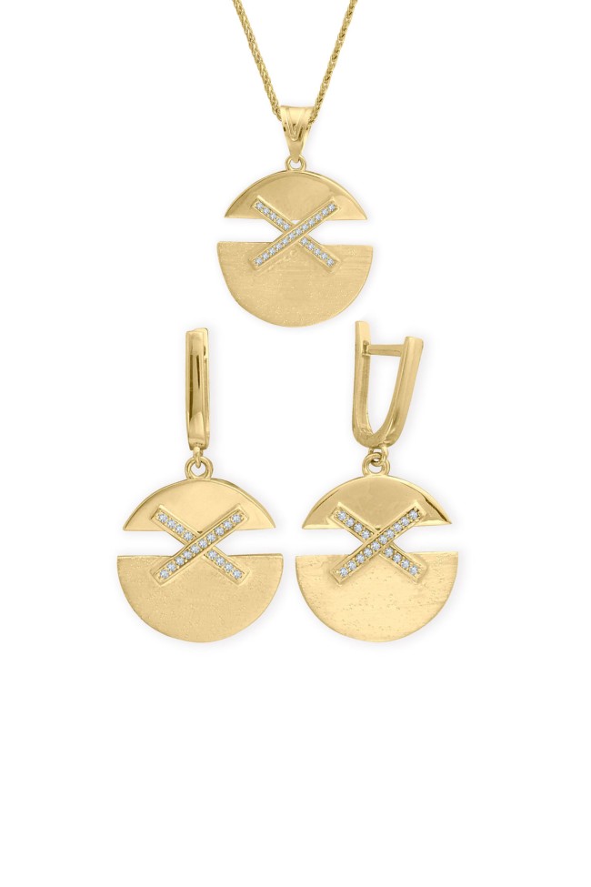 Çapraz taş detaylı model ışıl ışıl 14 ayar 13.40 gr ağırlığında harika bir duruşa sahip modern tasarım altın kolye, küpe set.