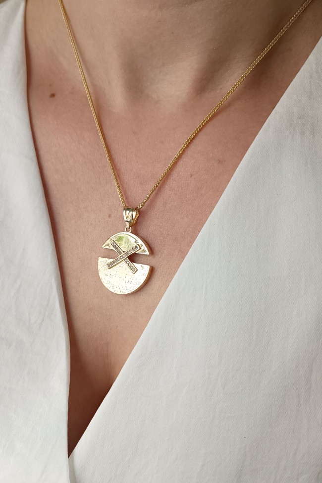 Çapraz taş detaylı model ışıl ışıl 14 ayar 4.80 gr ağırlığında harika bir duruşa sahip modern tasarım altın kolye ucu.