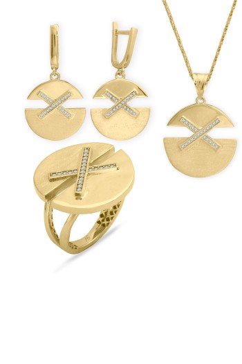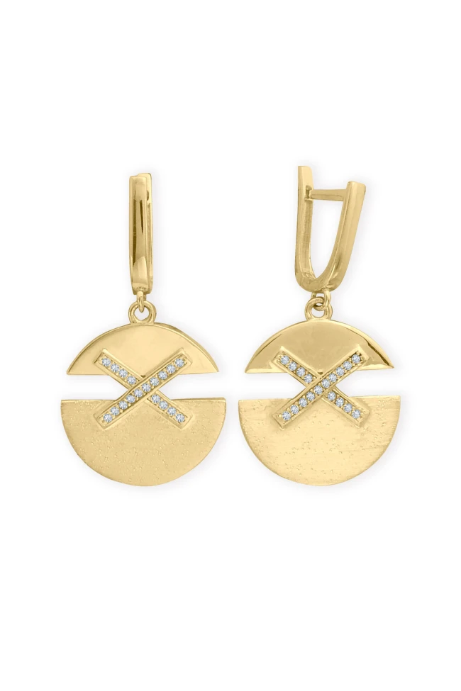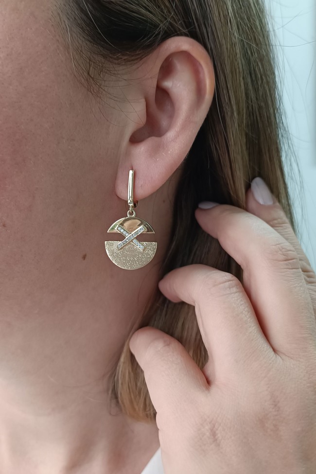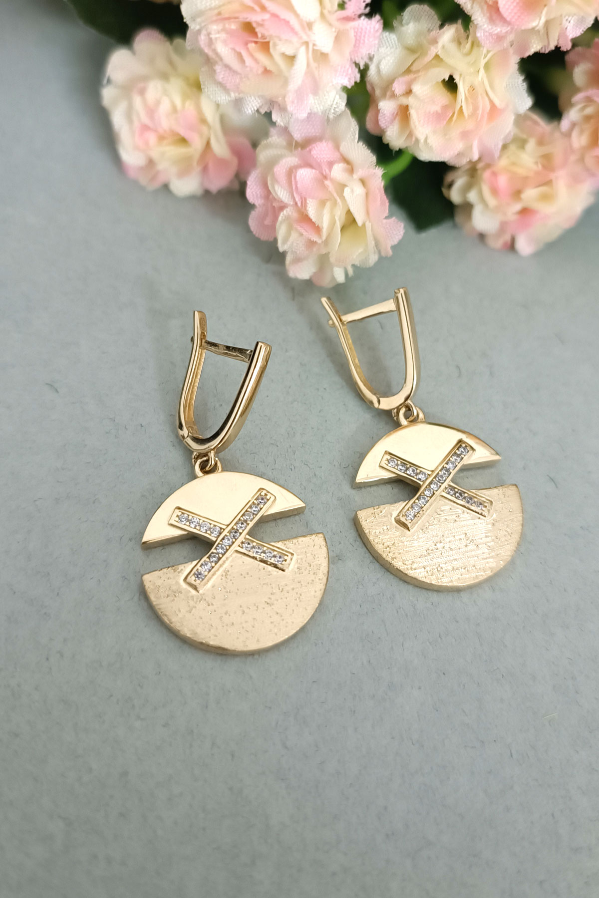 Çapraz taş detaylı model ışıl ışıl 14 ayar 6.70 gr ağırlığında 3.5 cm boyunda harika bir duruşa sahip modern tasarım altın küpe.