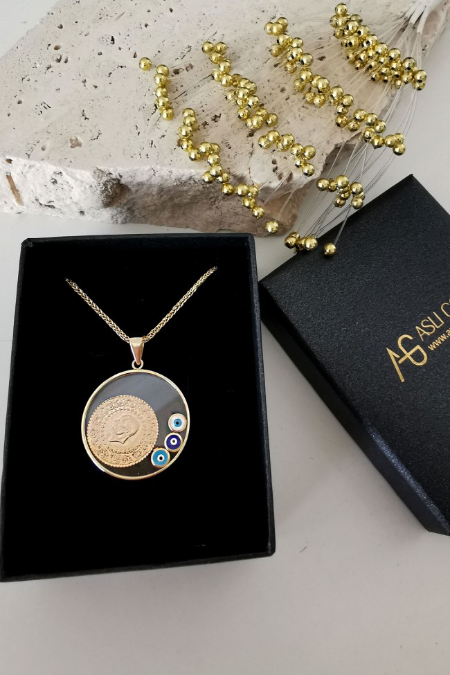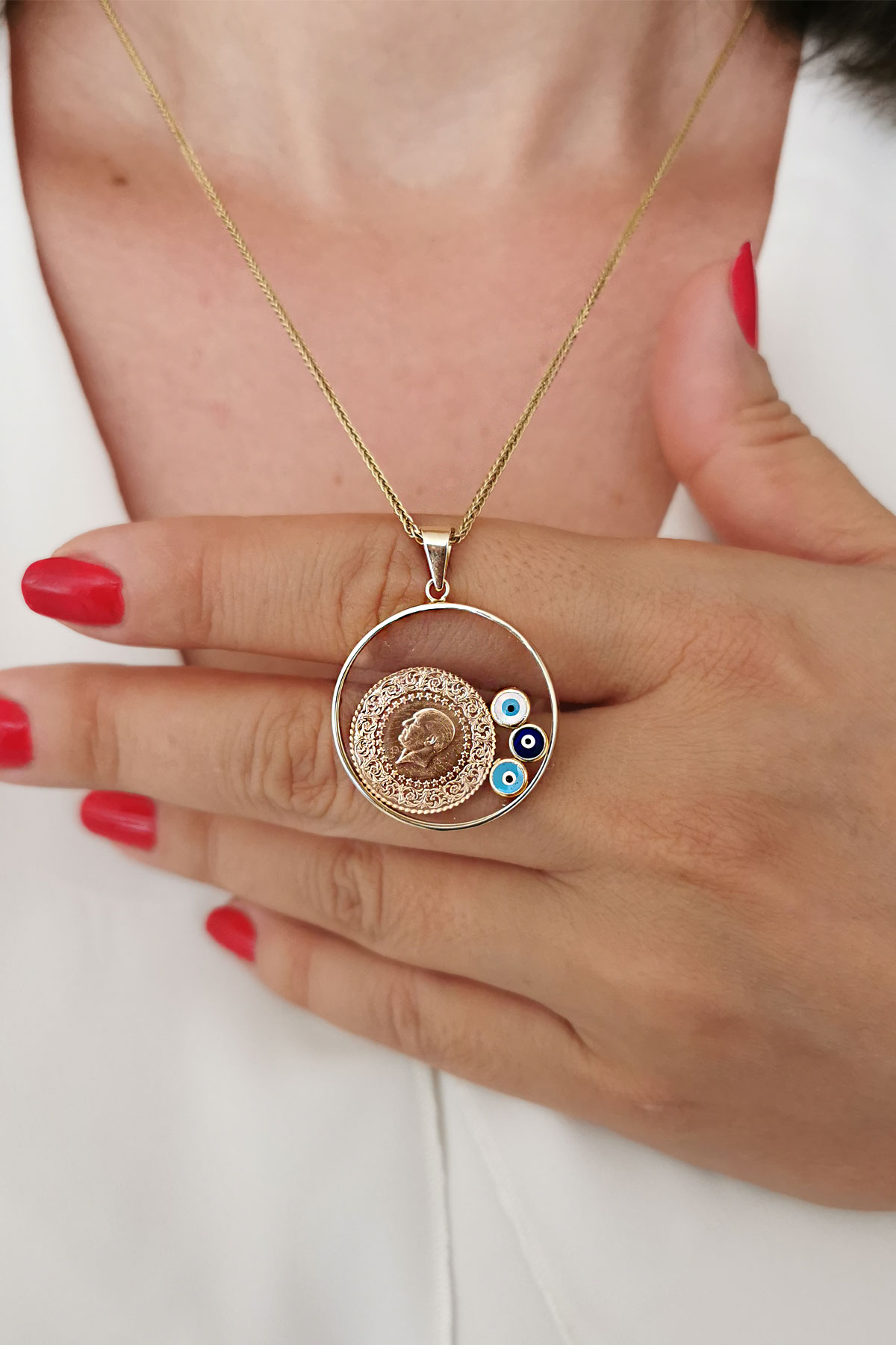 Spor Ve Günlük Kullanıma Uygun Işıl Işıl İçi Nazar Boncuğu Ve Çeyrek Altın Detaylı 4.70 Gr. Ağırlığında Çeyrekli  Altın Kolye Ucu.