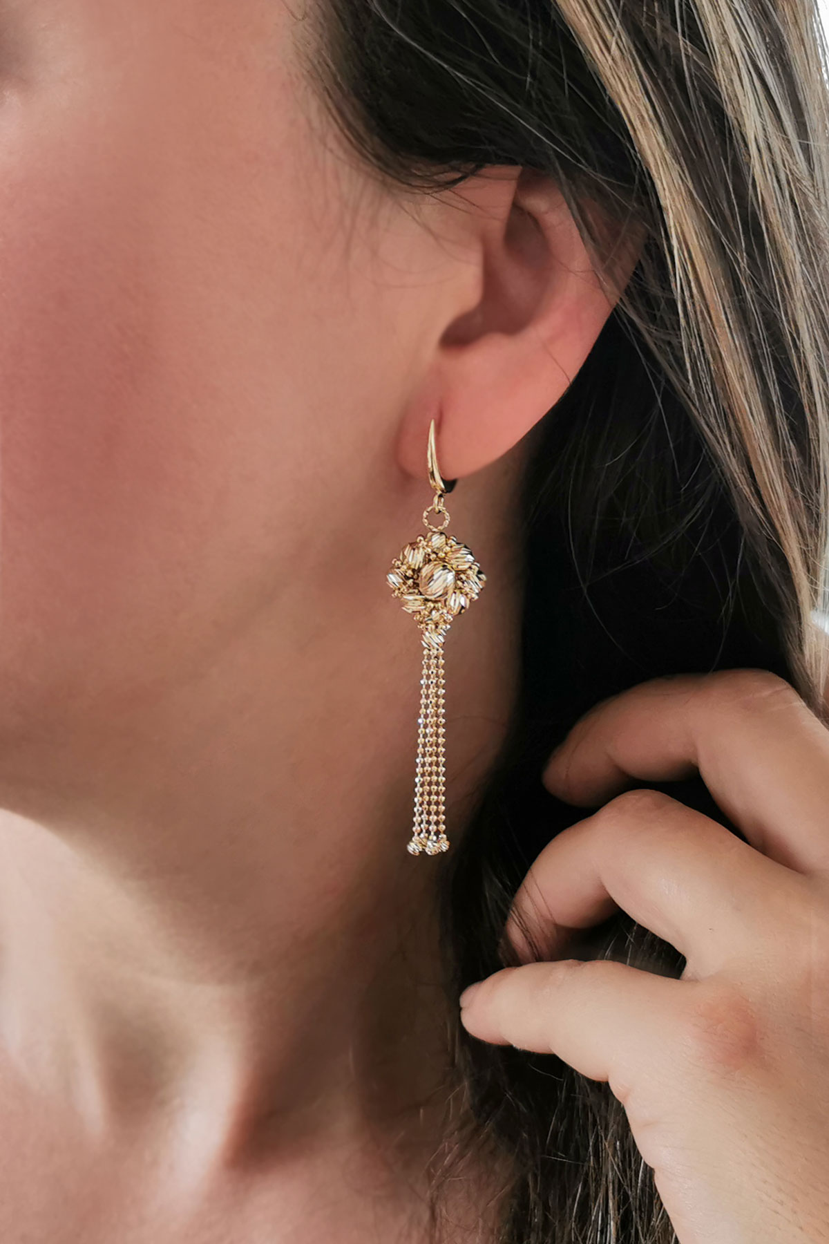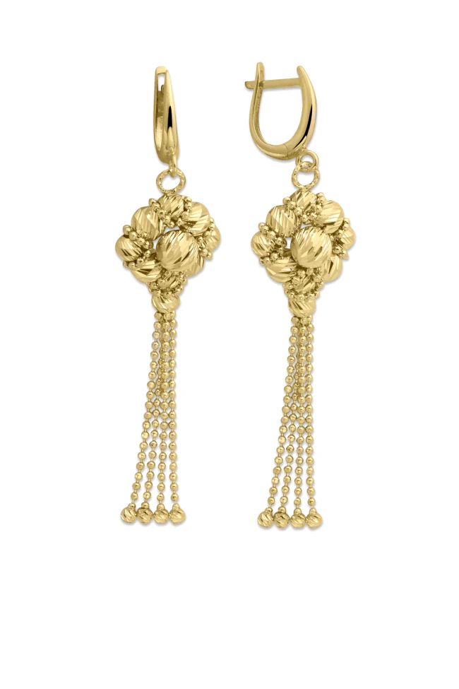 7.25 Gram Ağırlığında Çiçek Tasarım Dorika Top Detaylı Gösterişi İle Dikkatleri Üzerine Toplayan 14 Ayar Günlük ve Şık Bir Havaya Sahip 7.5 Cm Boyunda Altın Sallantılı İtalyan Küpe.