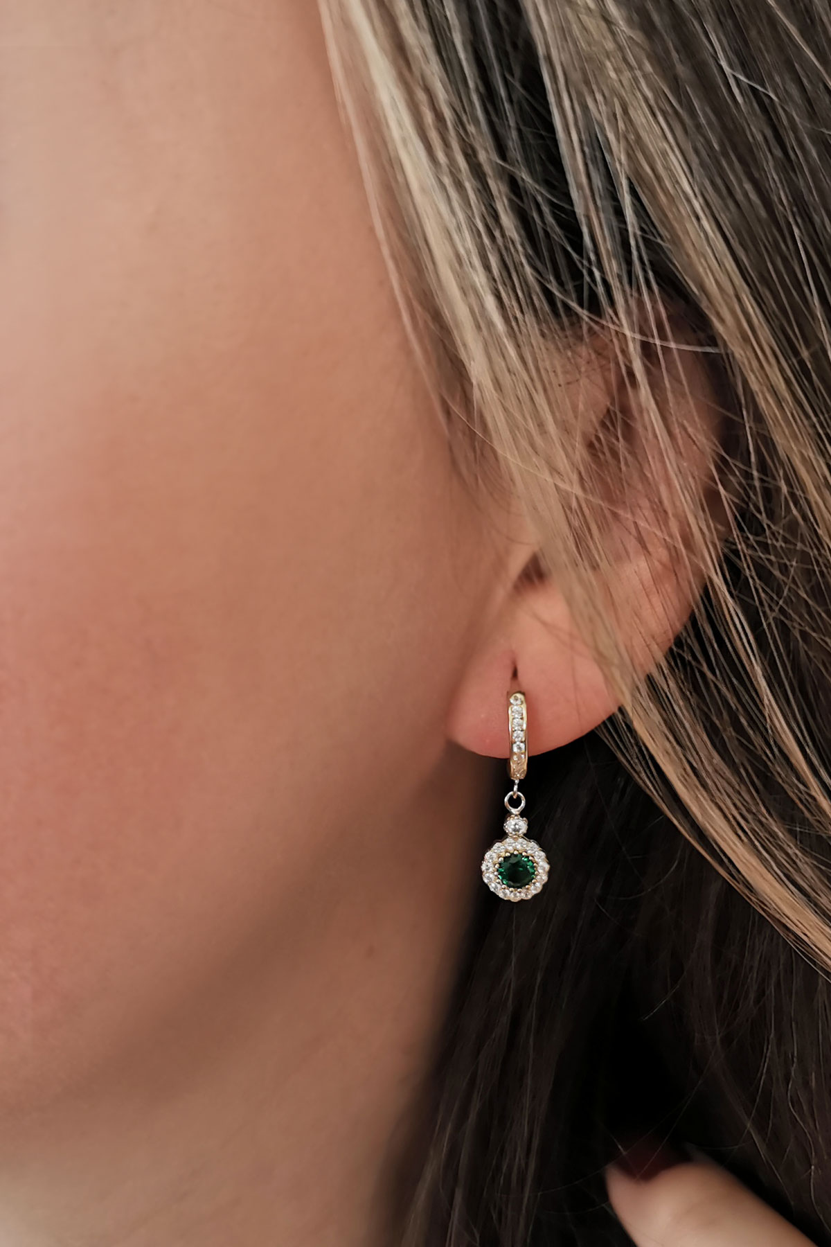 2.80 Gram Ağırlığında 2.5 Cm Çiçek Sallantılı Model Zirkon Zümrüt Taşlı Günlük, Modern Ve Şık Bir Duruşa Sahip 14 Ayar Altın Tasarım Küpe.