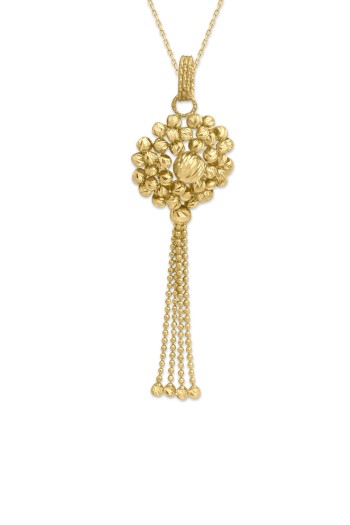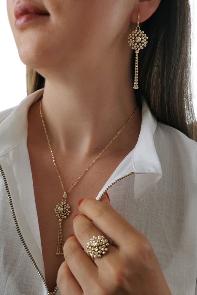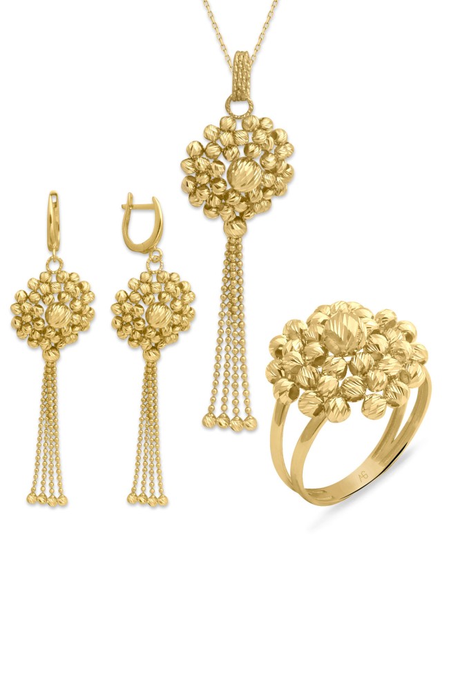 16.05 Gram Ağırlığında Özel Tasarım Dorika Top Detaylı Gösterişi İle Dikkatleri Üzerine Toplayan Çiçek Örgü 14 Ayar Günlük ve Şık Bir Havaya Sahip Kolye Ve Küpesi 7 Cm Boyunda Altın Sallantılı İtalyan Kolye, Küpe, Yüzük Takım.
