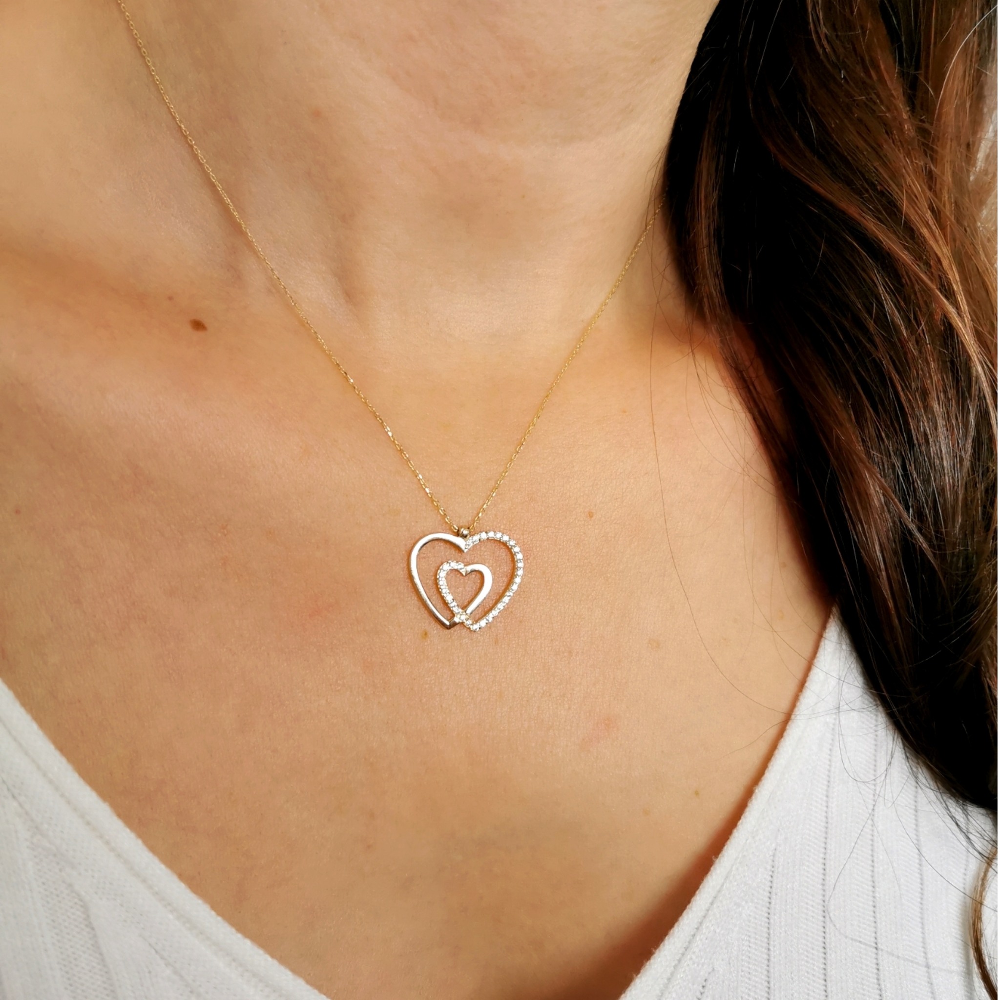 14 Ayar 2.00 gram ağırlığında 45 cm kendinden zincirli iç içe iki kalp tasarımıyla dikkat çekici şık ışıl ışıl zirkon taşlı kalp kolye.