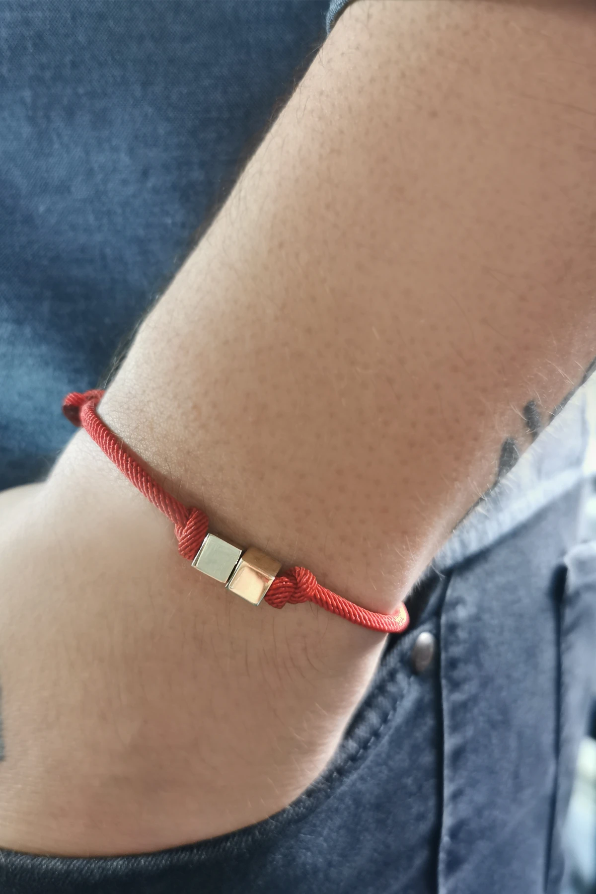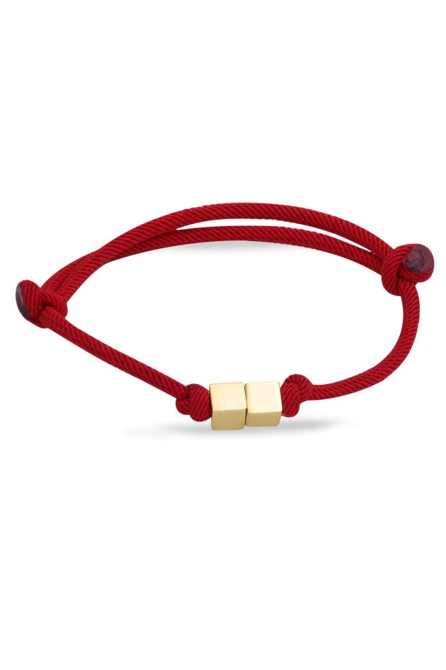 Çift küp detaylı tasarımı ile günlük olarak da kullanabileceğiniz, özel günlerinde sevdiklerinize şık bir hediye seçeneği olacak 0.80 gr ağırlığında 14 ayar altın taşsız kırmızı özel örgü ip detaylı unisex kullanıma uygun spor bileklik.
