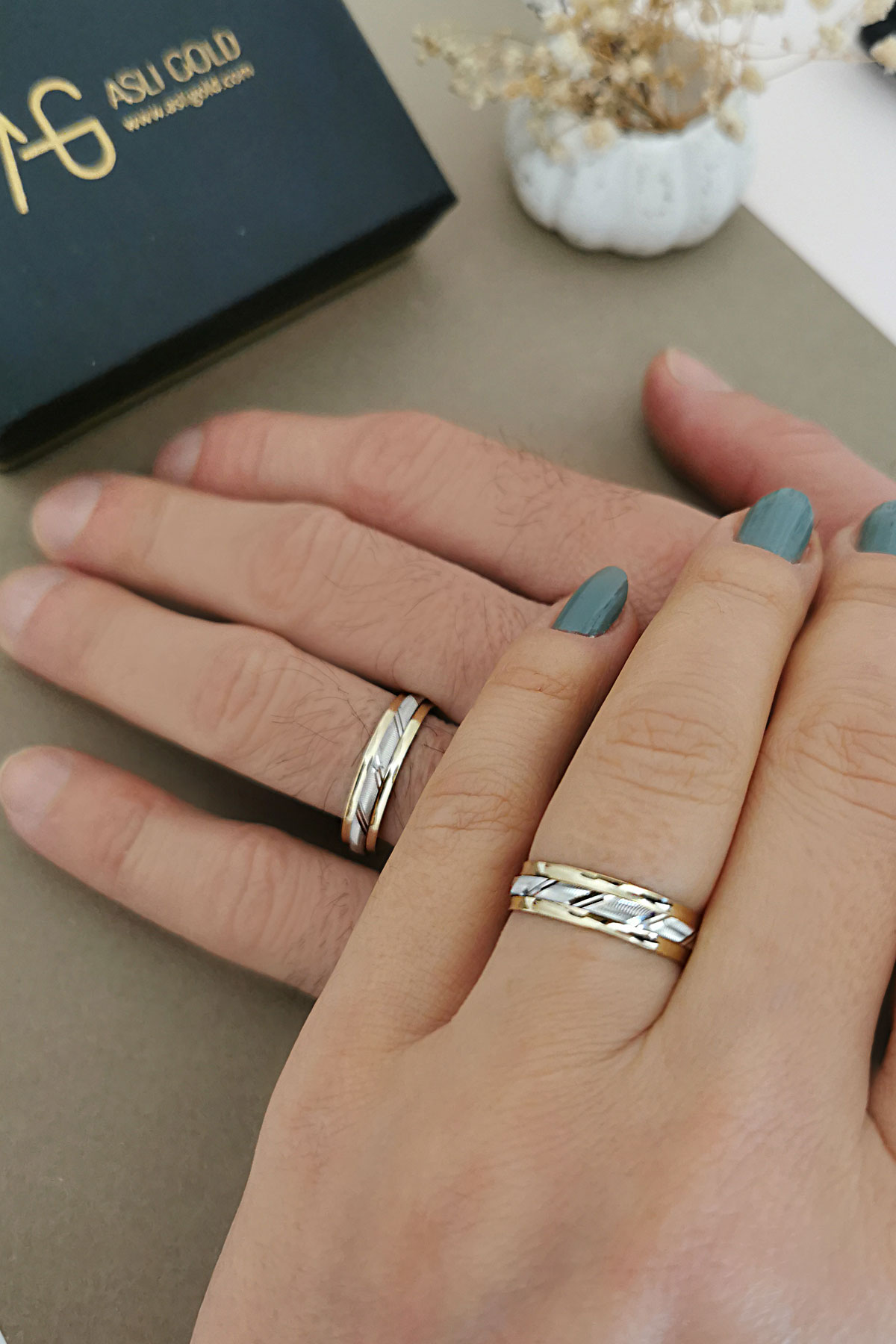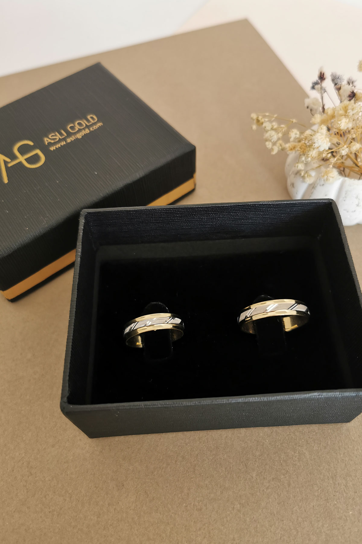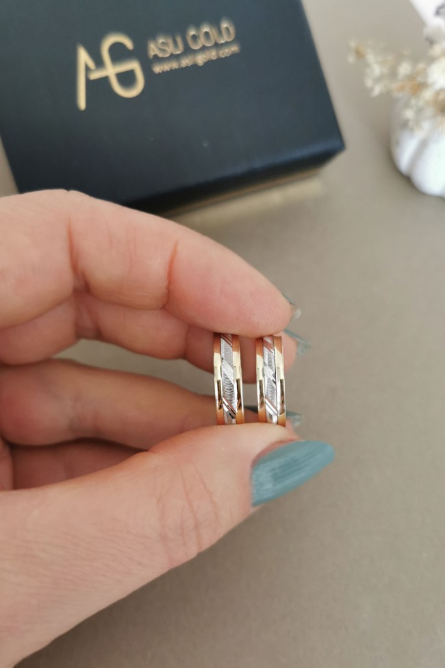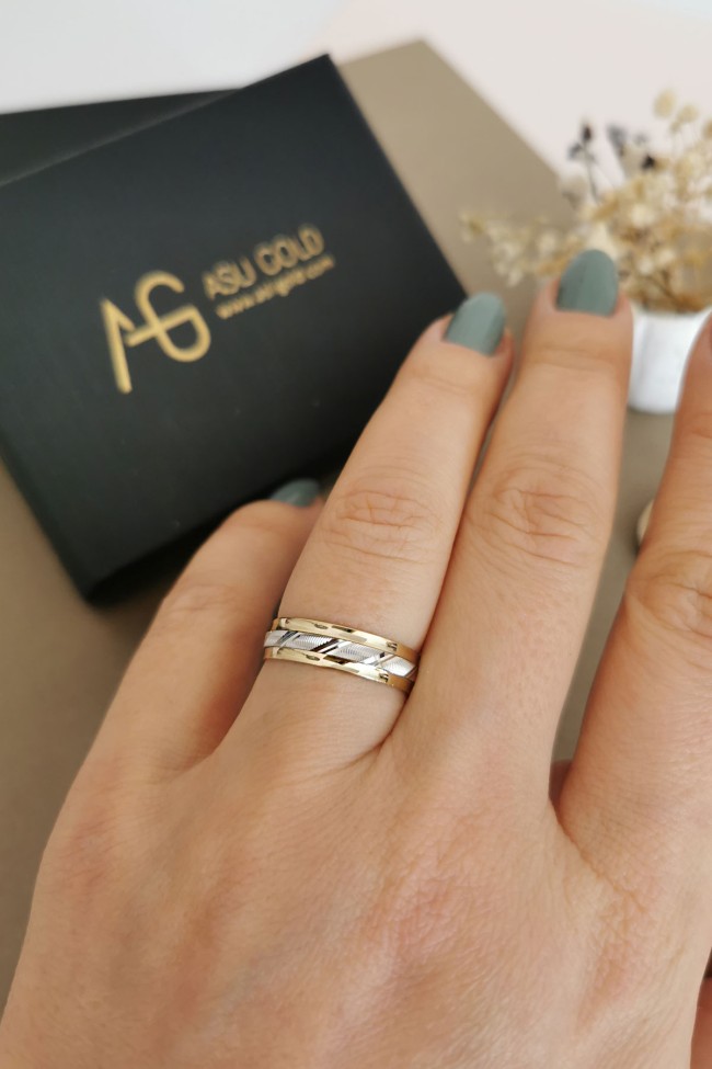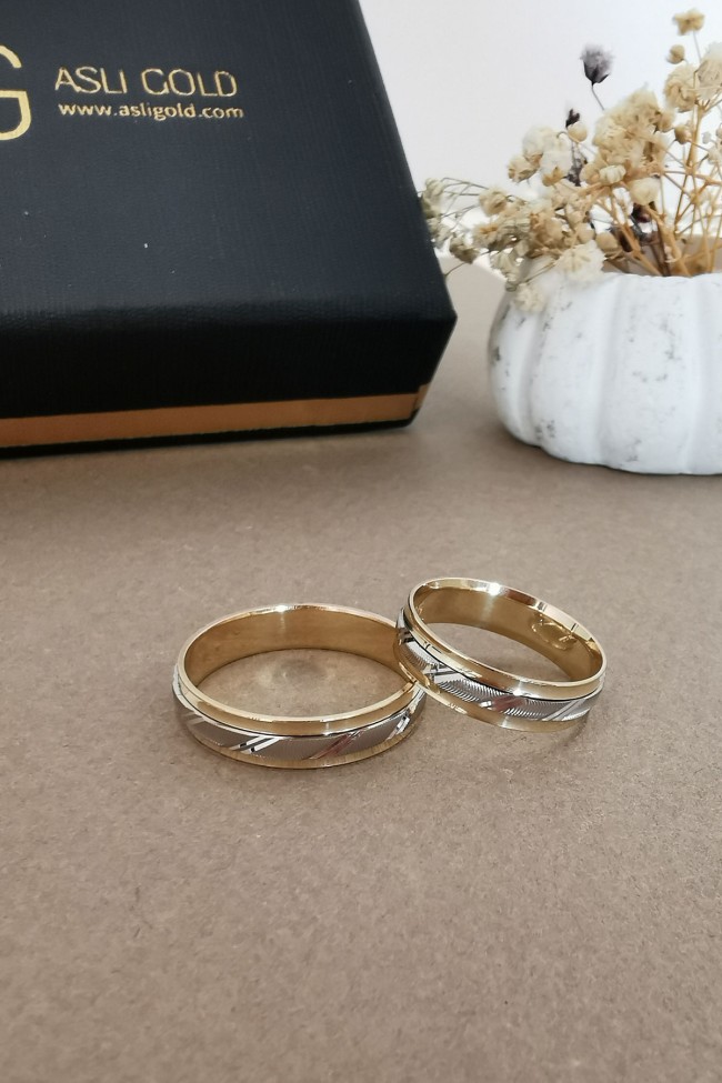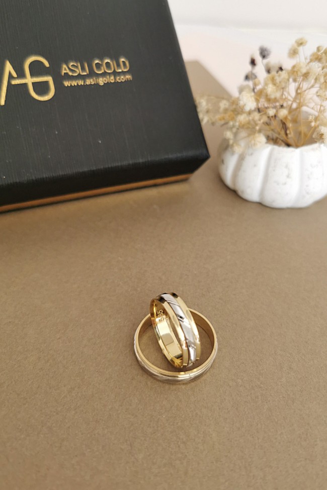 14 Ayar 6.30 gram ağırlığında çift renk orta beyaz parçası dönen şık ve günlük kullanımda sizi oldukça rahat ettirecek unisex kullanıma uygun, modern bir tasarıma sahip evlilik, nişan alyansı olarak da  tercih edebileceğiniz altın çift alyans.