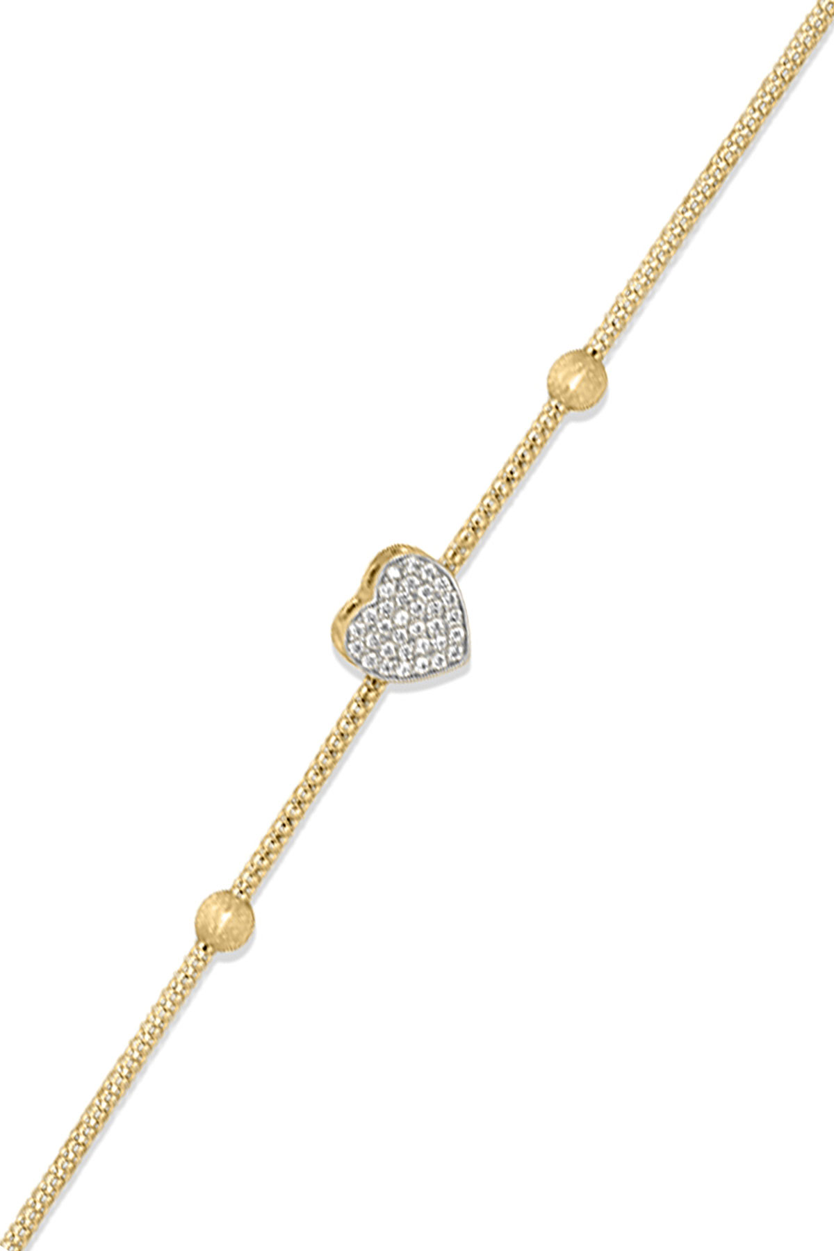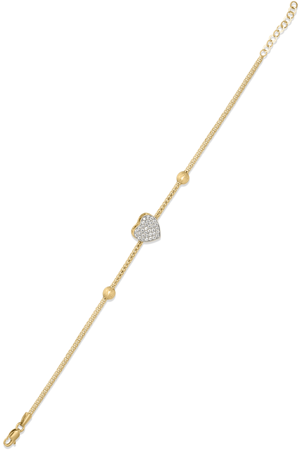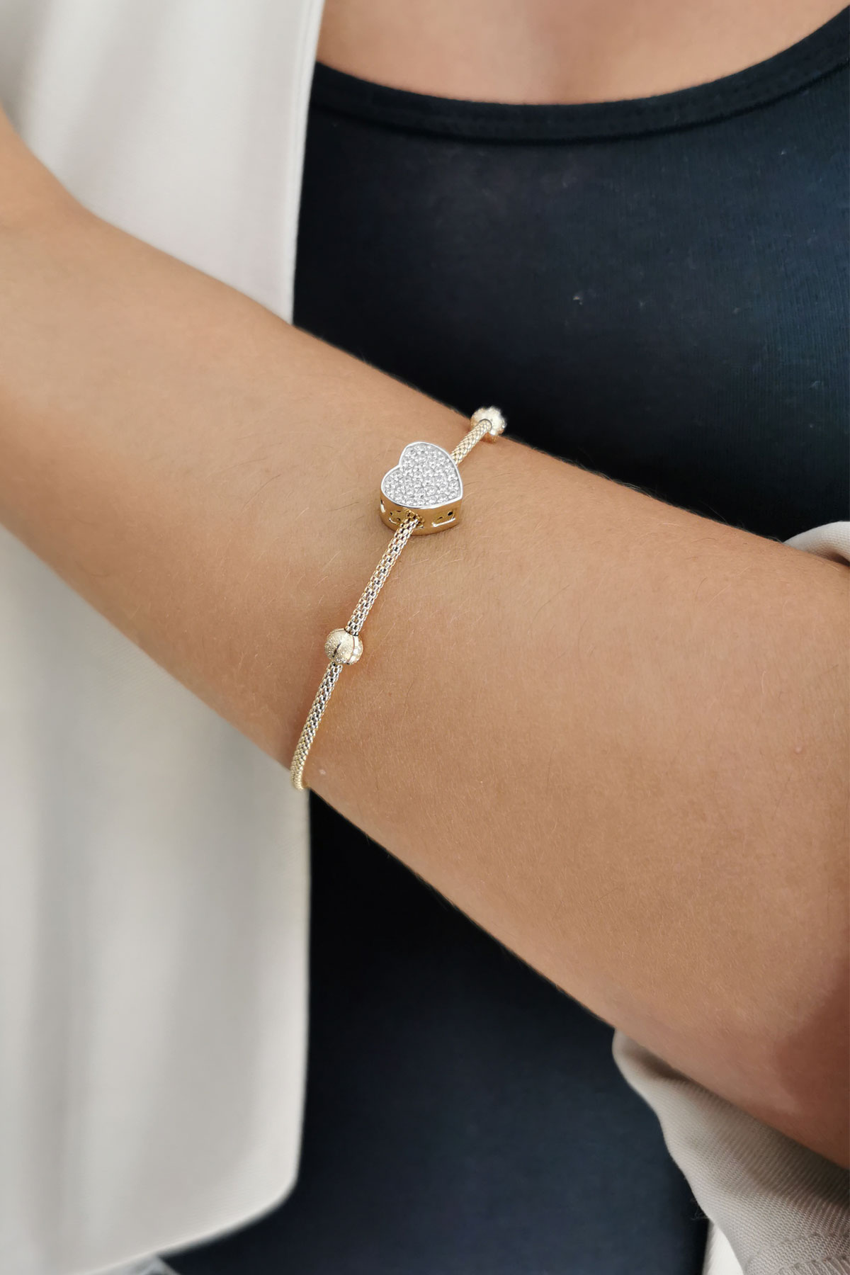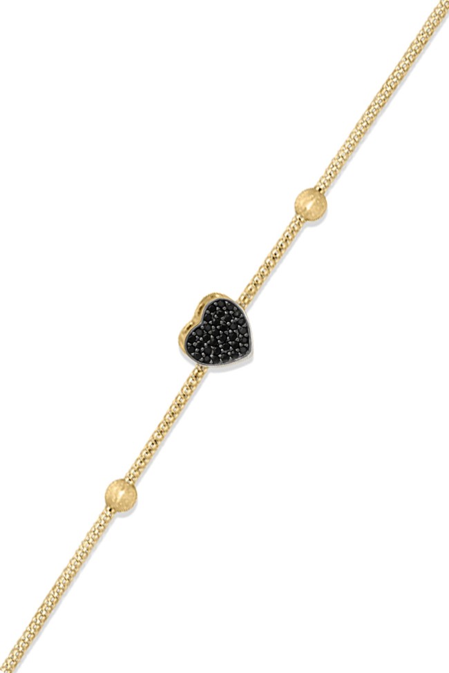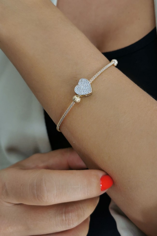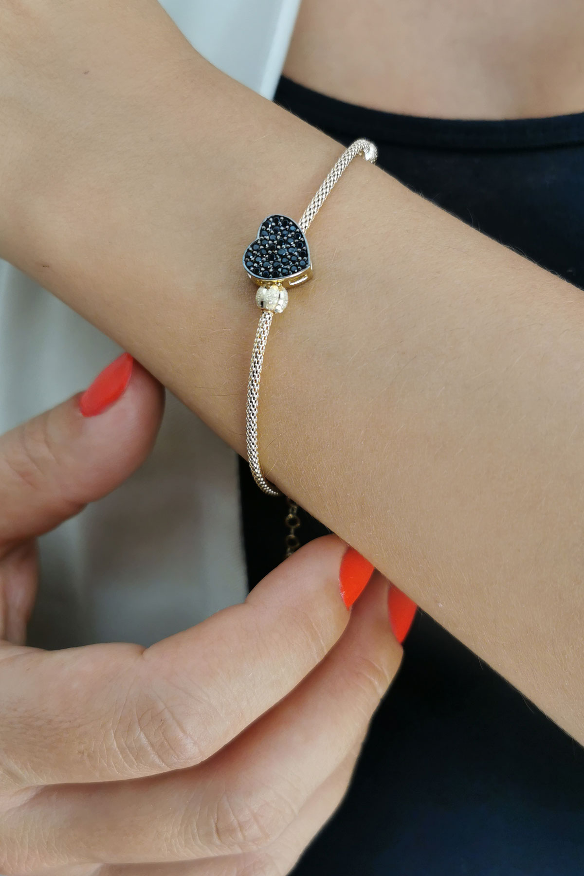 14 Ayar bir tarafı siyah taş detaylı diğer tarafı beyaz taş detaylı kalpli tasarımı ile spor duruşa da sahip günlük kullanıma uygun 4.70 gram ağırlığında zirkon taşlı altın bileklik.
