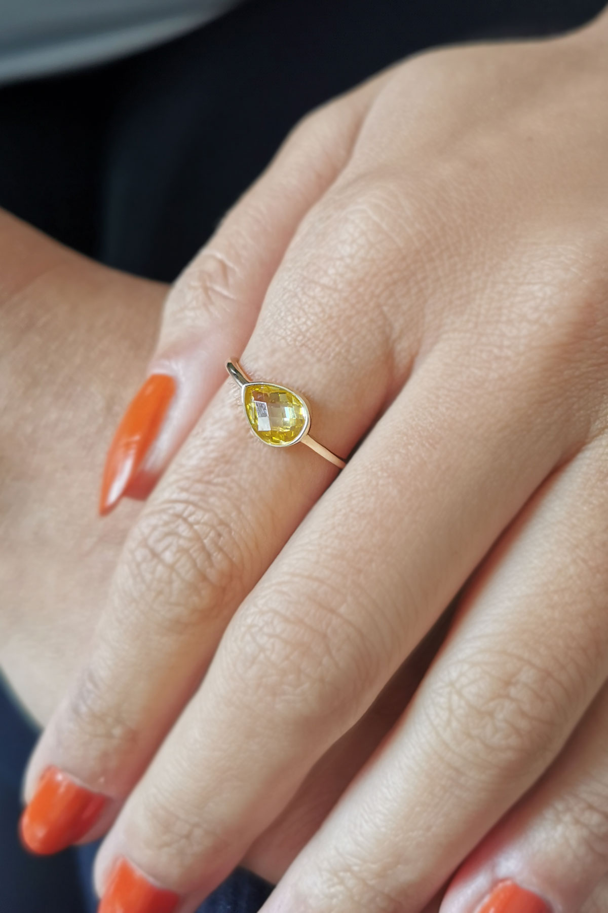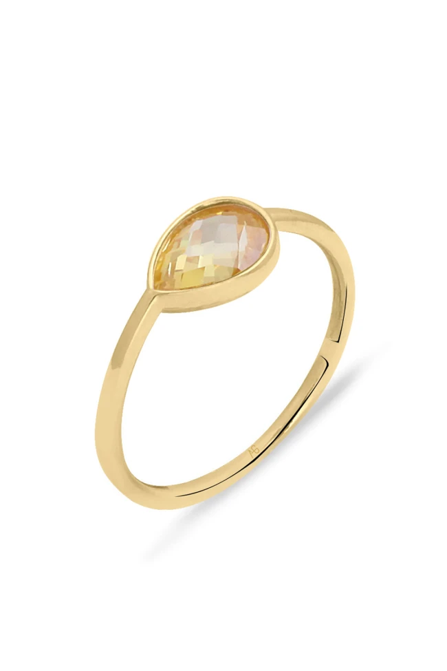 14 Ayar sade tasarımı ile zarif duruşa sahip damla kesim enerjik citrine taşlı sevdiklerinize yada kendinize armağan olarak tercih edebileceğiniz modern model günlük kullanıma uygun 1.80 gram ağırlığında altın yüzük.