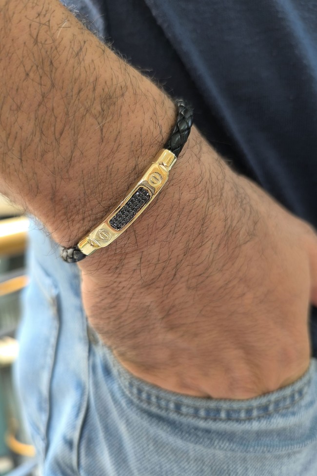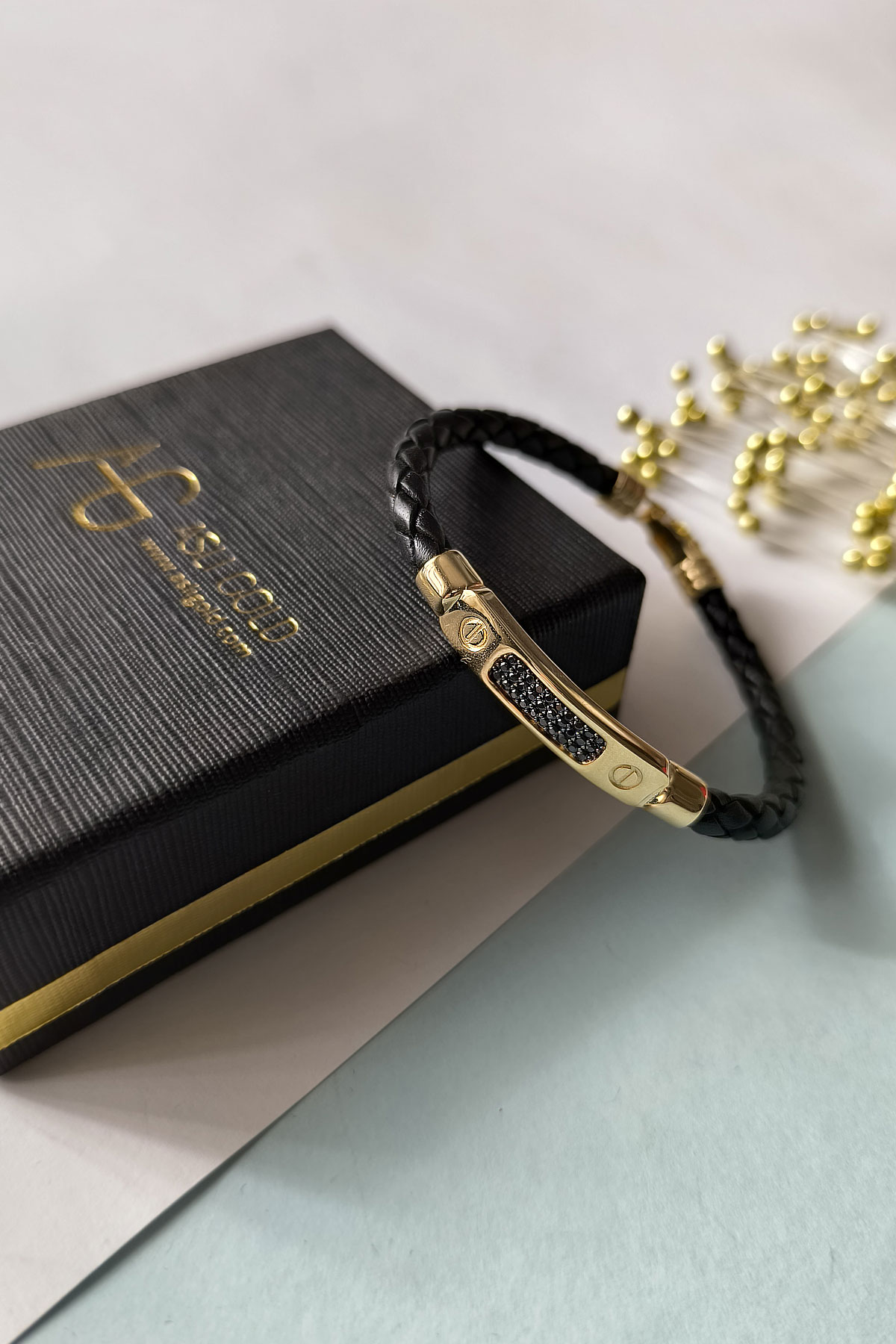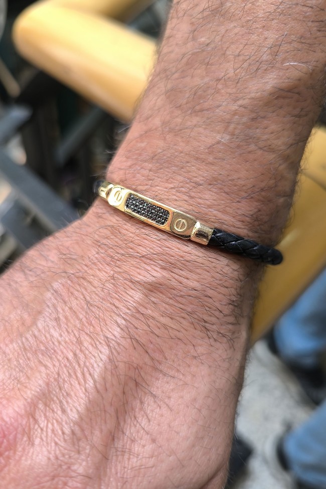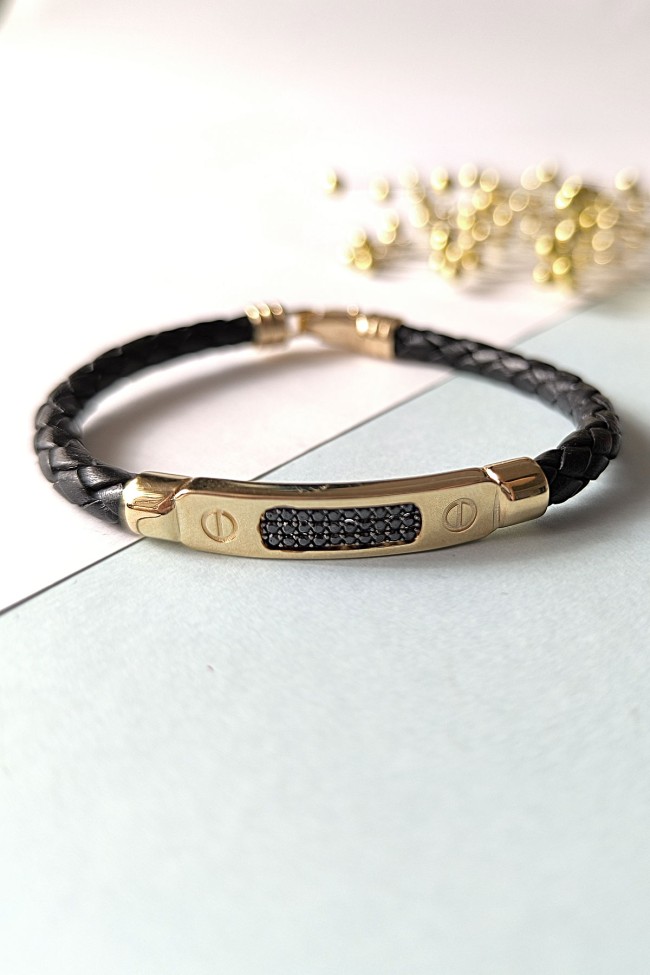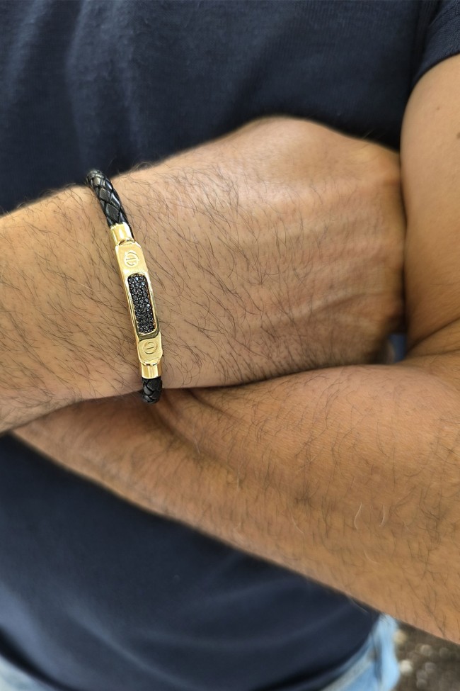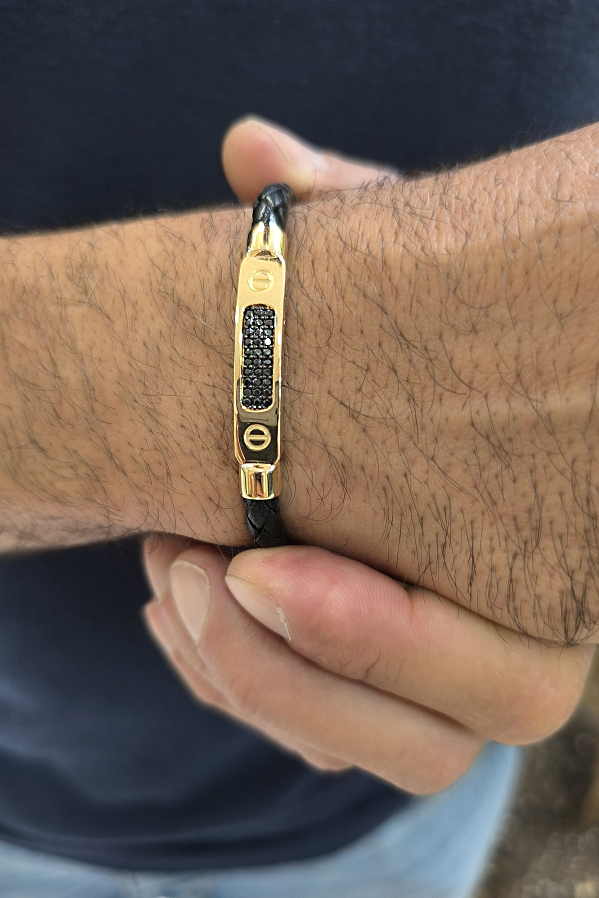 14 Ayar Siyah Taş Ve Çivi Başı Model Detaylı Günlük Kullanıma Uygun Deri Spor Altın Erkek Bileklik.