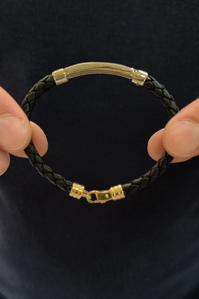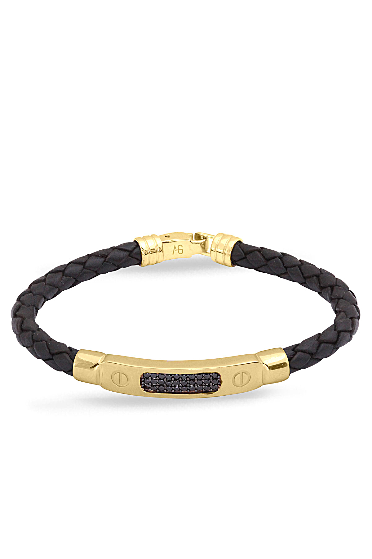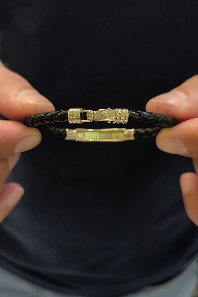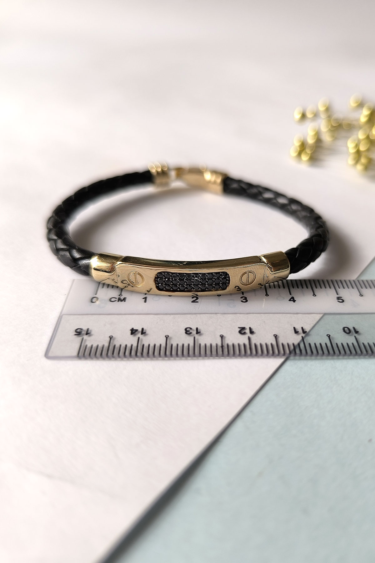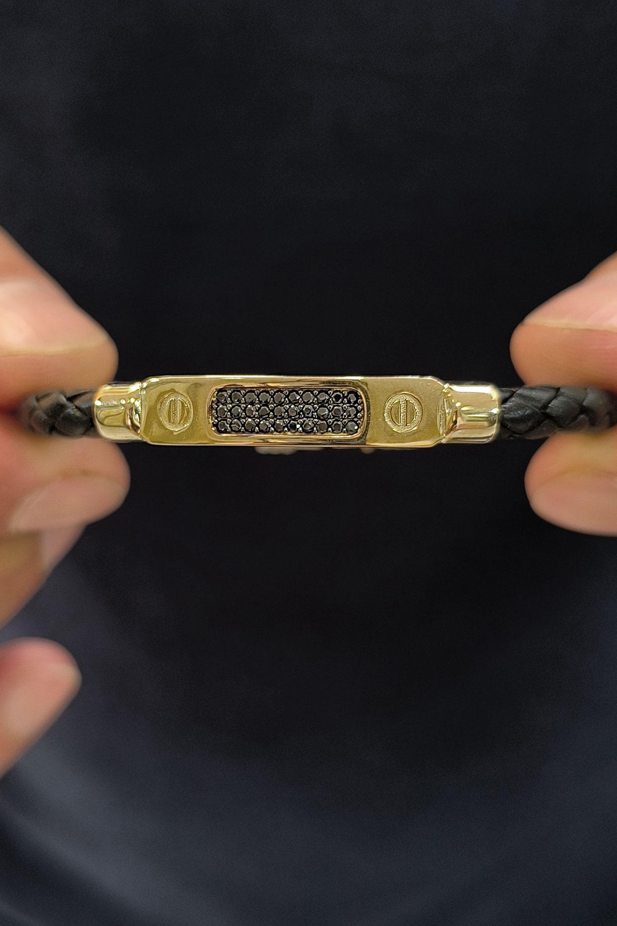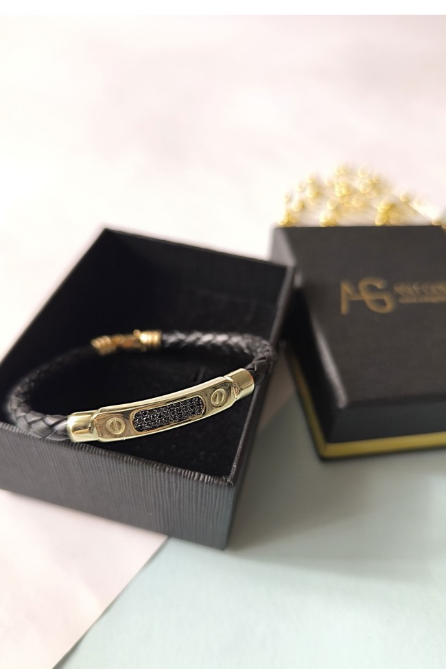 14 Ayar Siyah Taş Ve Çivi Başı Model Detaylı Günlük Kullanıma Uygun Deri Spor Altın Erkek Bileklik.