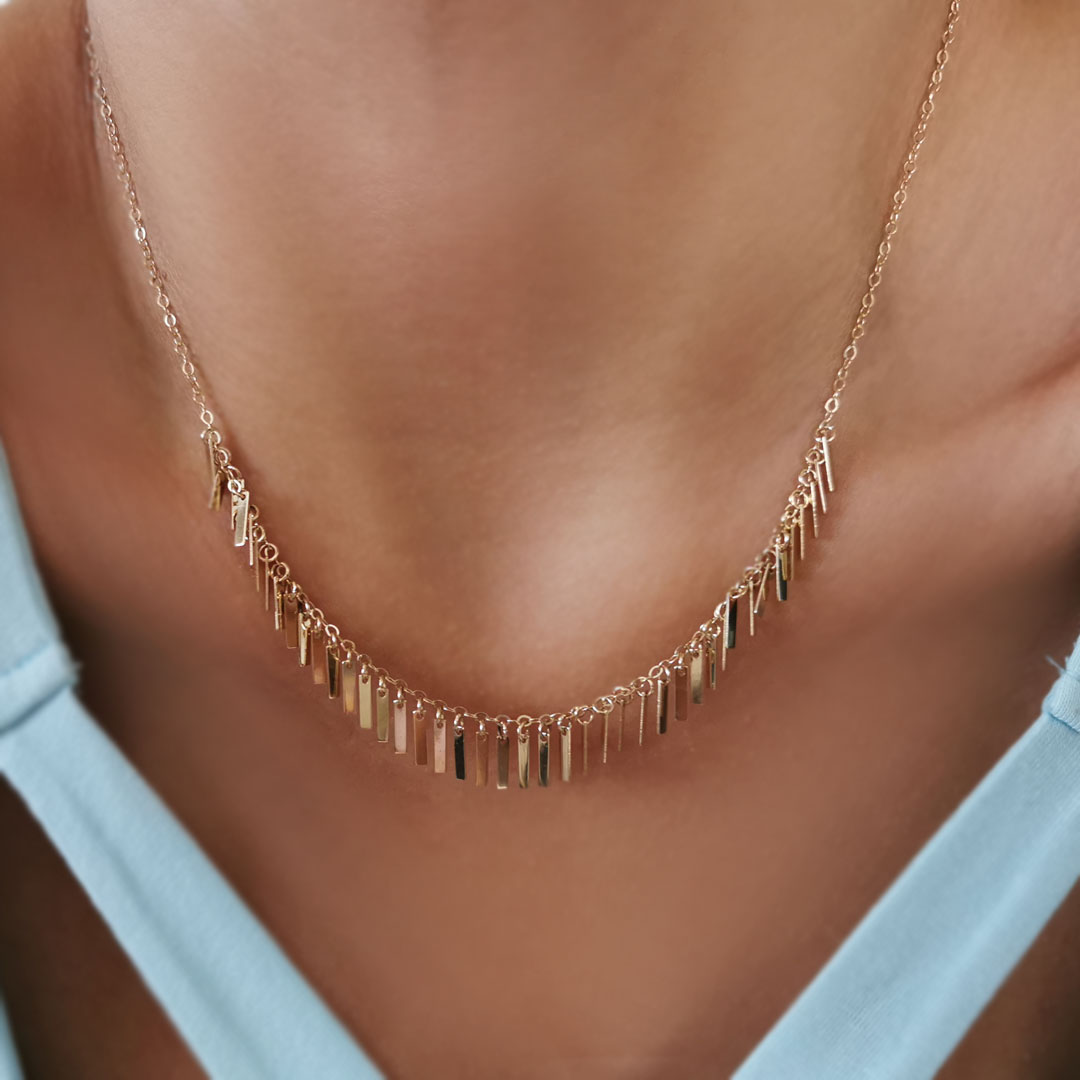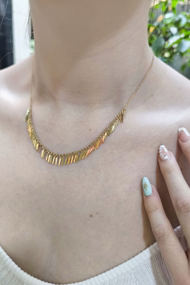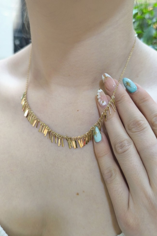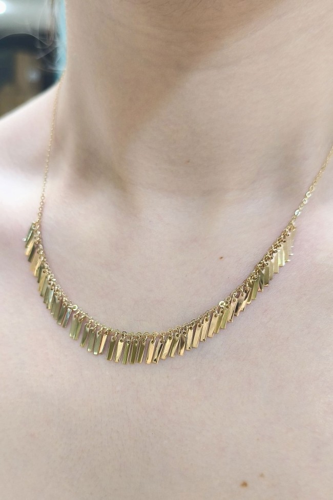 14 Ayar 5.65 gram ağırlığında 45 cm boyunda pullu çubuk detay tasarımıyla yaz kış severek kullanacağınız, spor giyim tarzınıza da muhteşem uyum sağlayacak tasarım ışıl ışıl altın kolye.