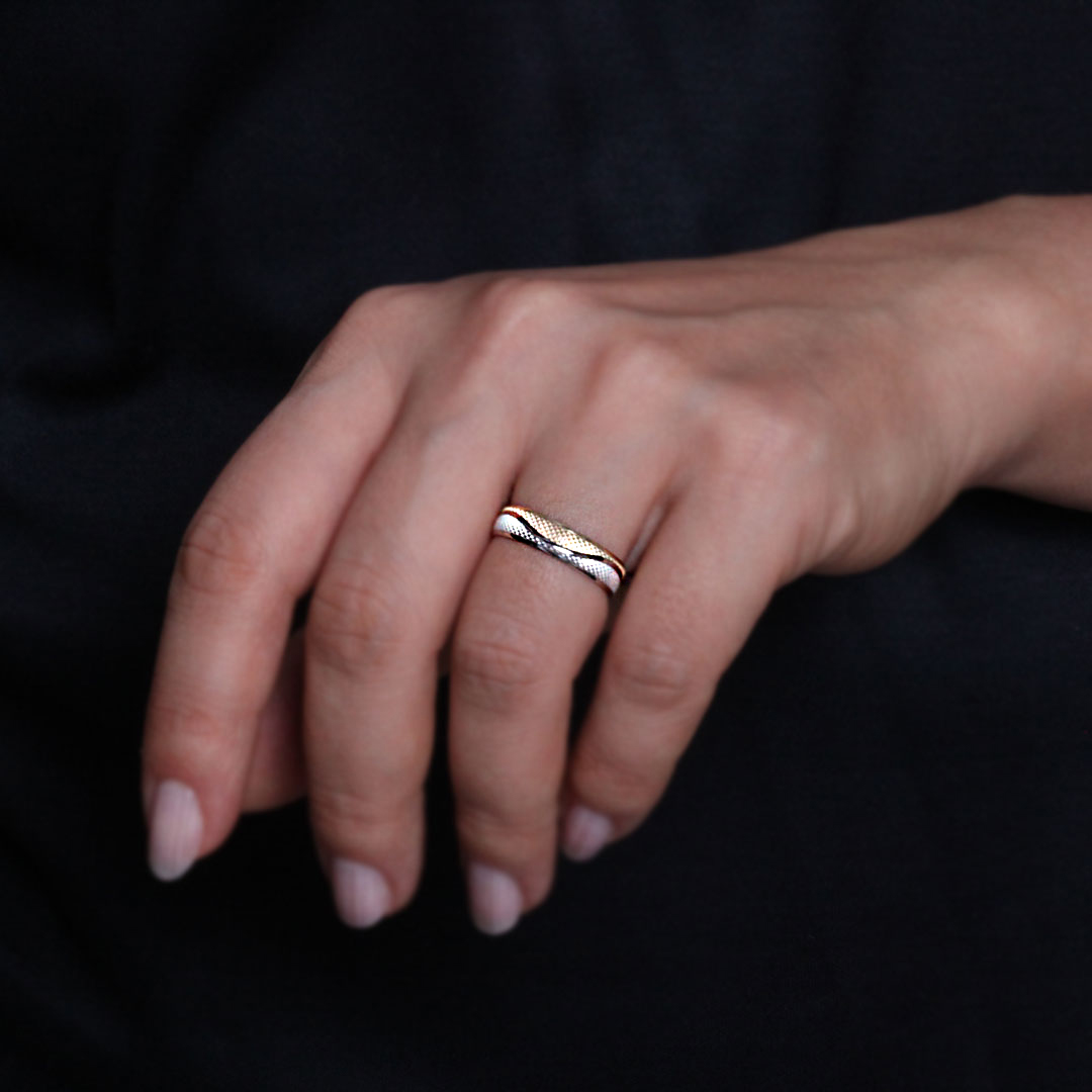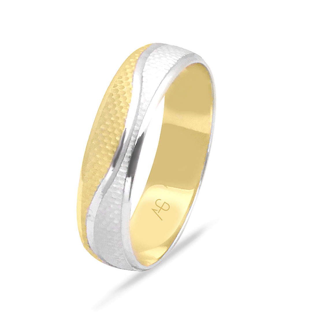 14 Ayar sarı /beyaz altın dalgalı modeliyle şık duruşa sahip günlük kullanıma uygun 3.40 gram ağırlığında taşsız hem kadın hem erkek kullanımına uygun alyans.