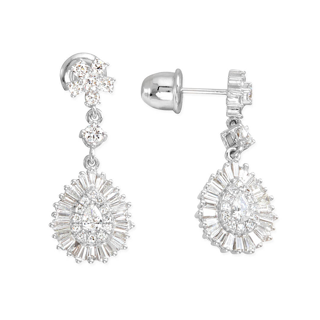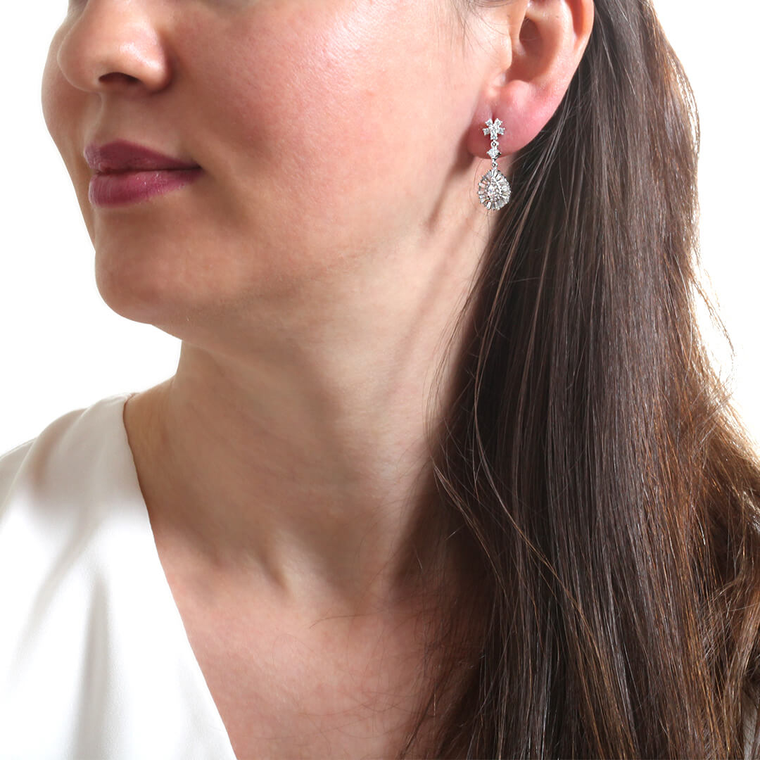 1.65 karat yuvarlak ve baget G-SI kesim pırlantalarla kombine taşlanmış tamemn el emeği, özel işçilik kalitesiyle tasarlanmış hafif sallantılı oldukça şık ve elit bir modele sahip pırlanta 14 ayar beyaz altın damla formlu küpe.