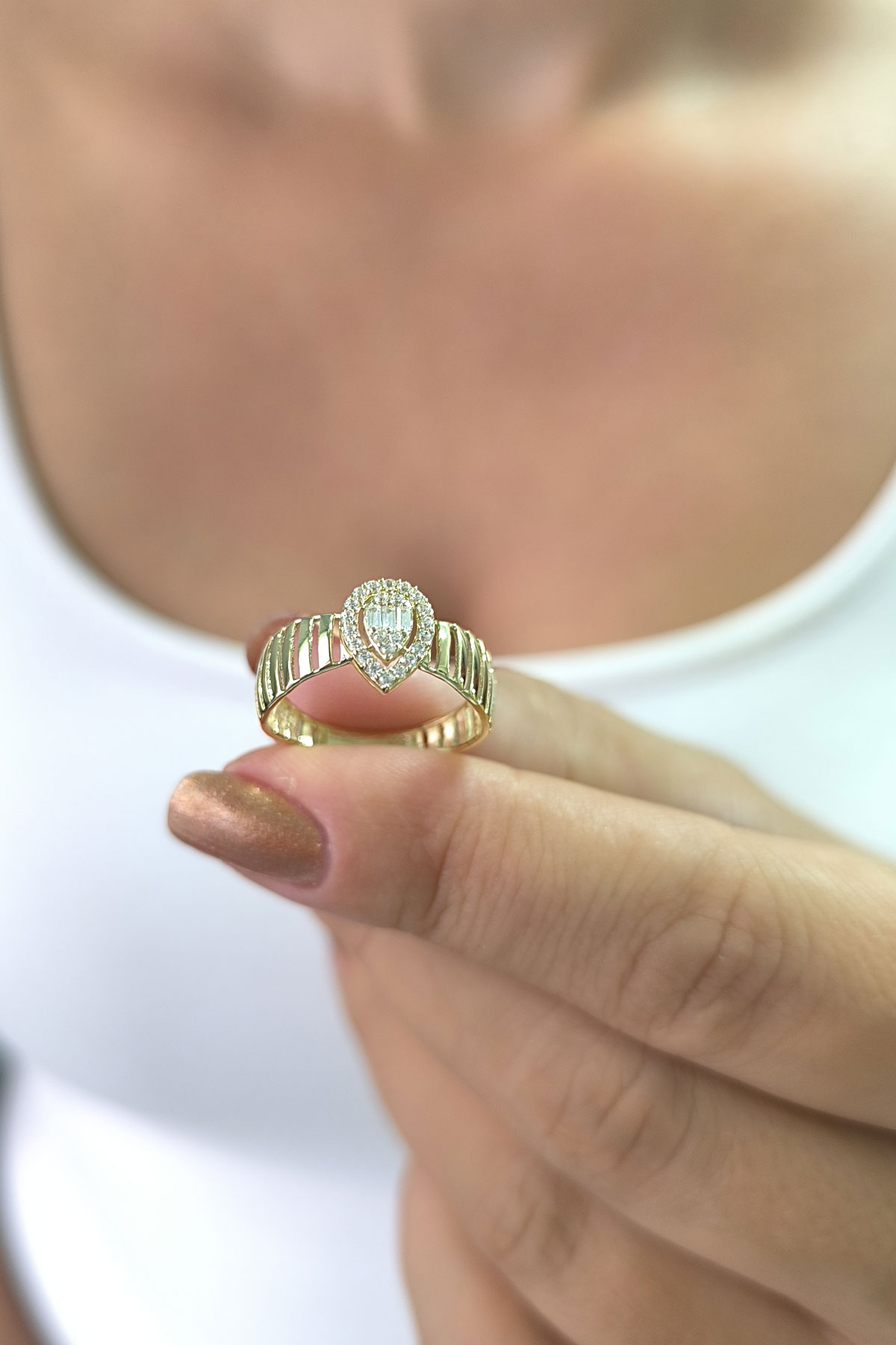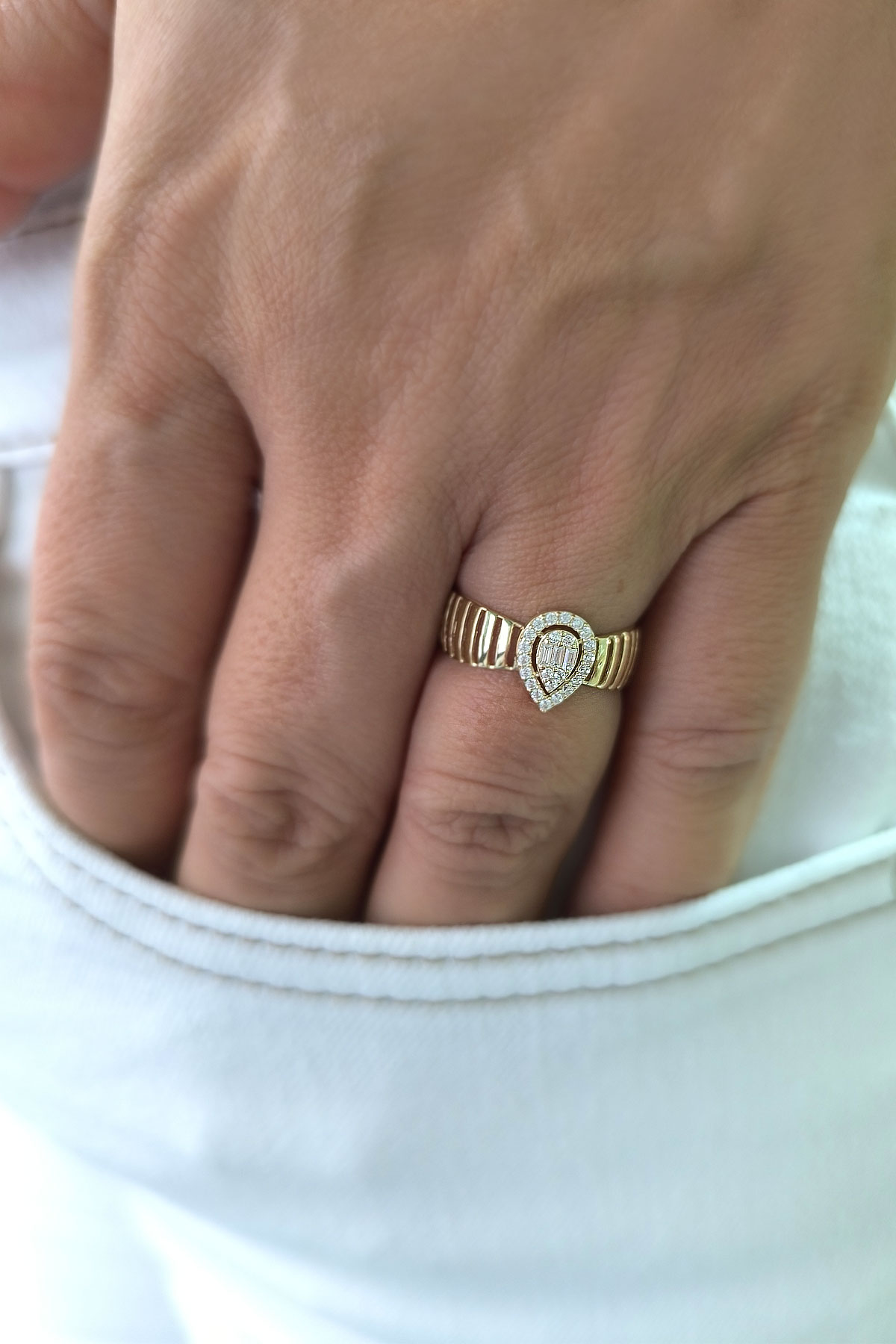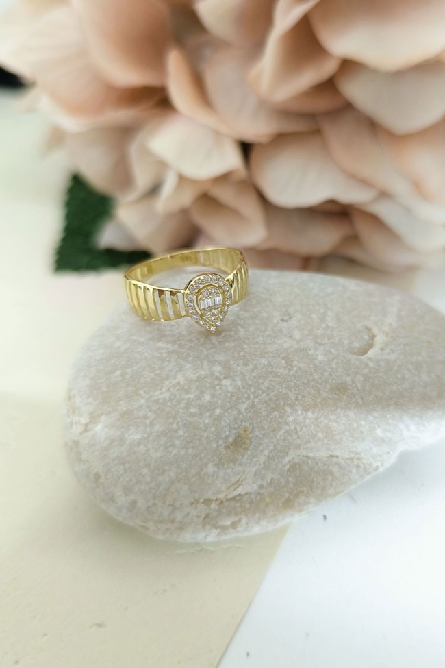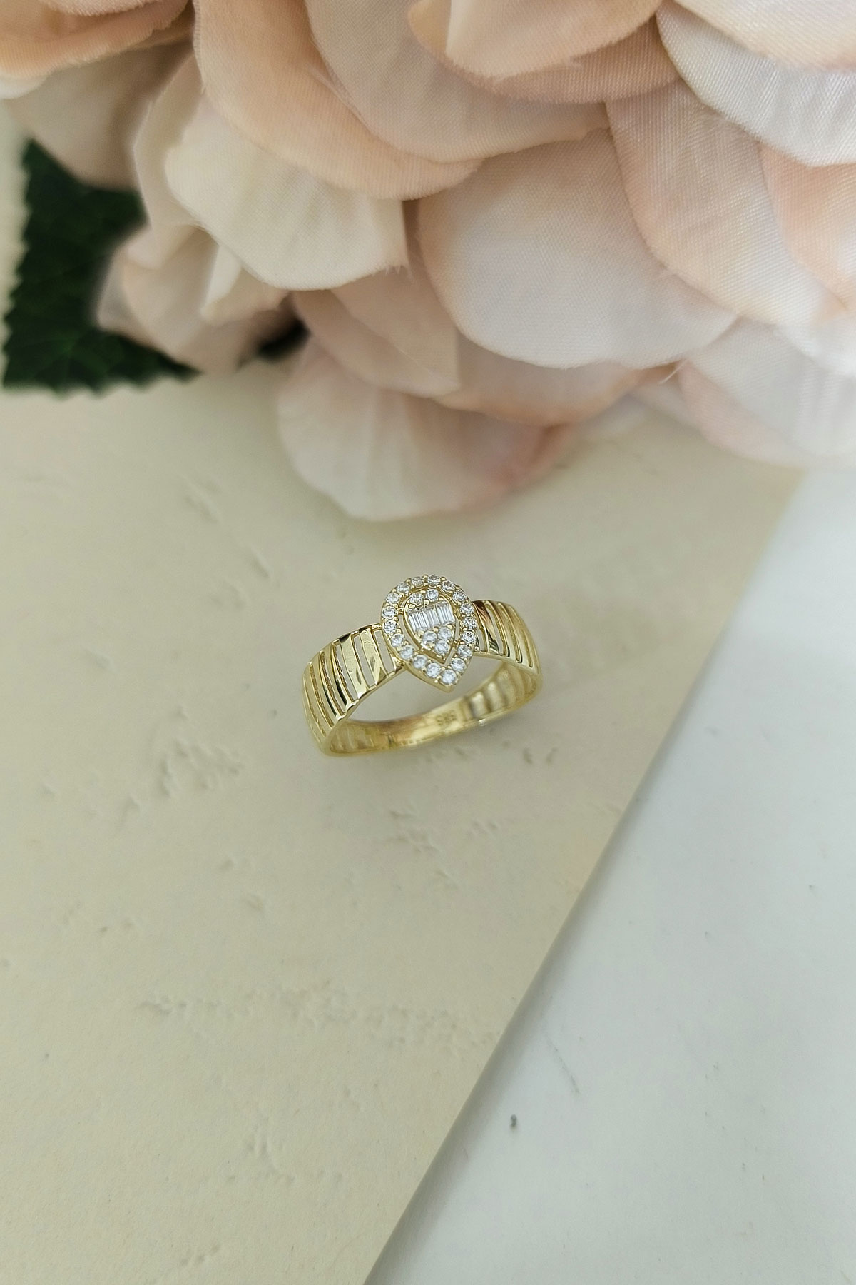 Damla model baget taşlı 14 ayar sarı altın tasarımıyla günlük kullanıma uygun 2.05 gram ağırlığında modern ve zarif kadın yüzük.