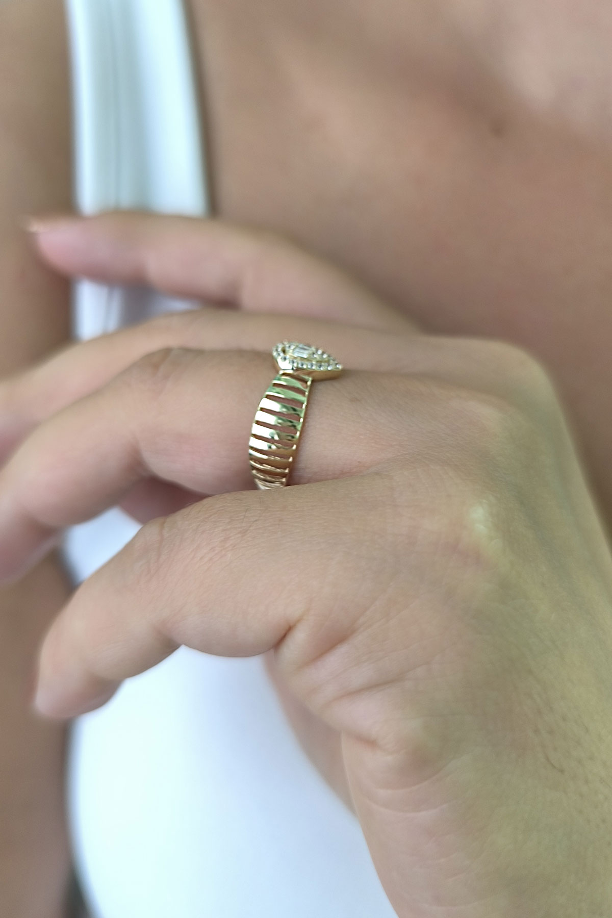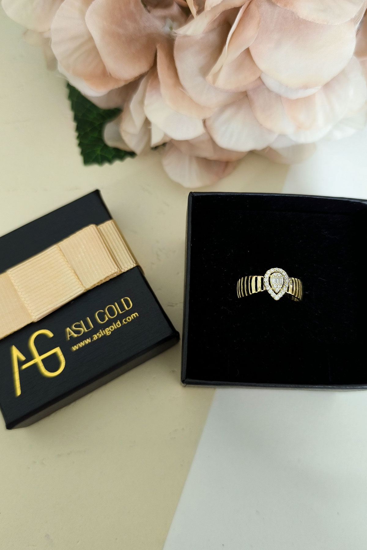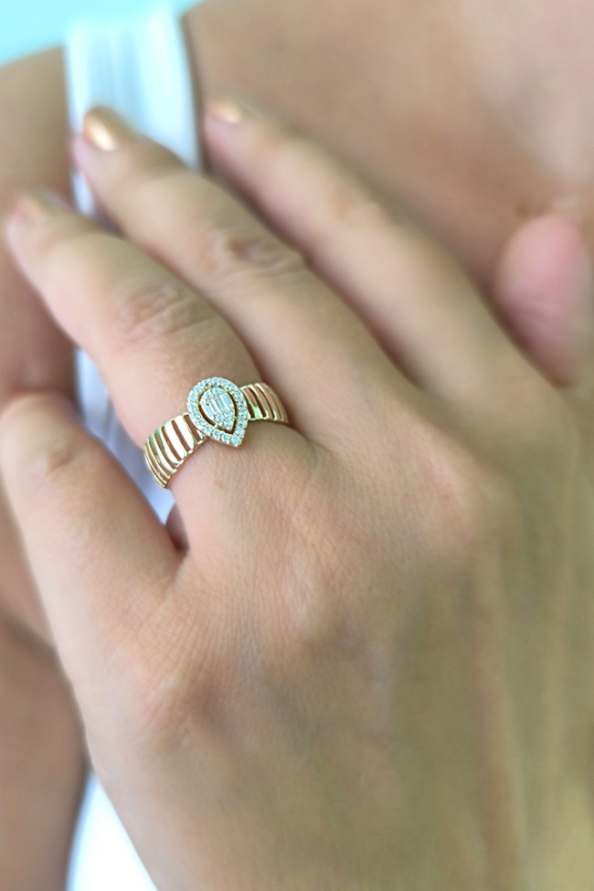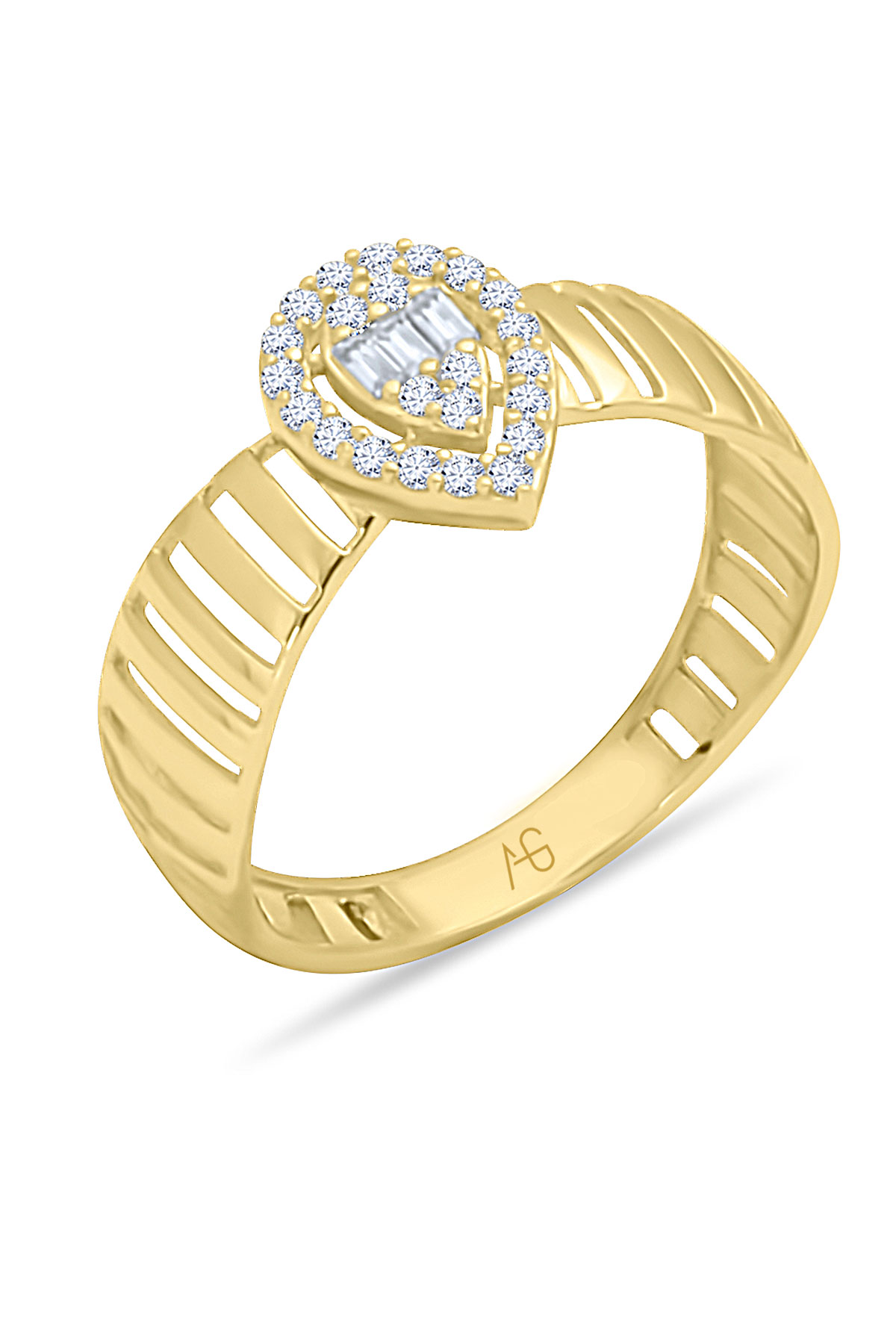Damla model baget taşlı 14 ayar sarı altın tasarımıyla günlük kullanıma uygun 2.05 gram ağırlığında modern ve zarif kadın yüzük.