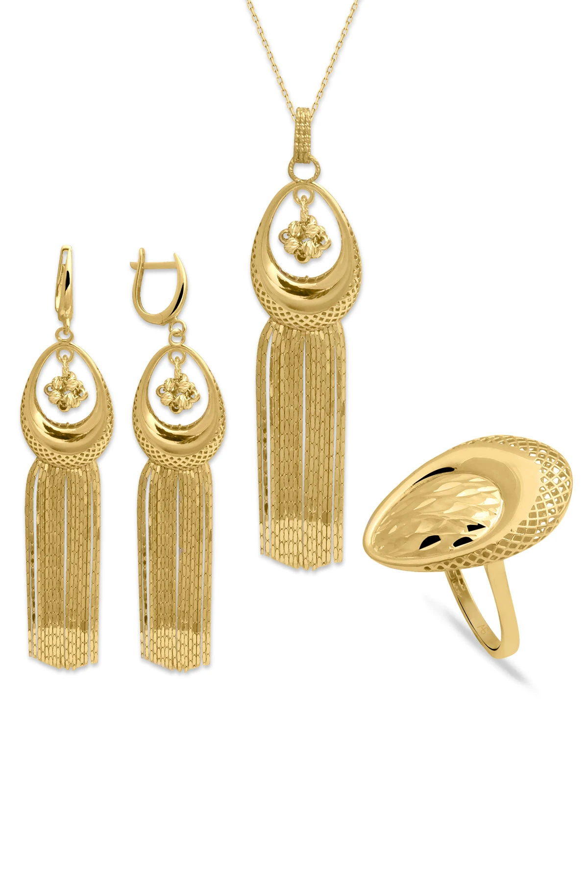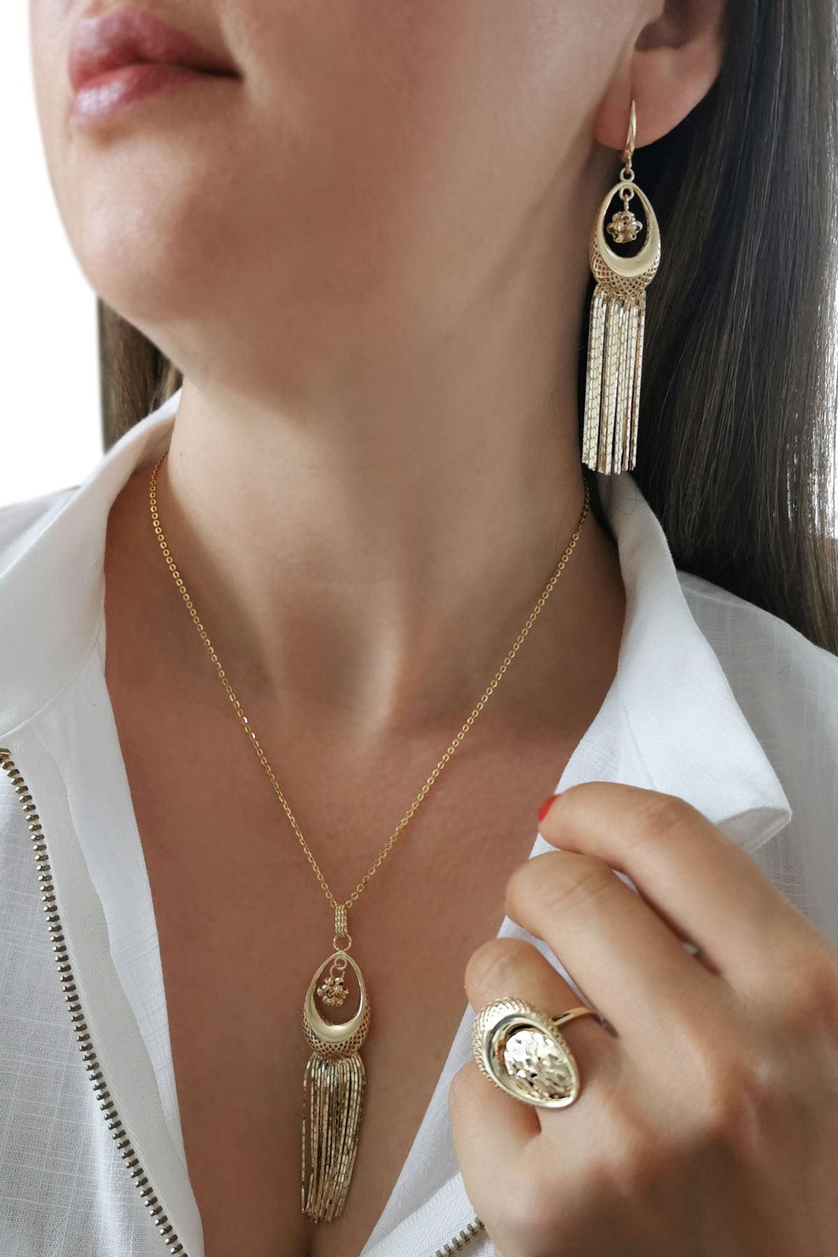 24.40 Gram Ağırlığında Öval Tasarım Dorika Top Detaylı Gösterişi İle Dikkatleri Üzerine Toplayan 14 Ayar Modern ve Şık Bir Havaya Sahip Kolye Ve Küpesi 7.5 Cm Boyunda Altın Püsküllü İtalyan Kolye, Küpe, Yüzük Takım.