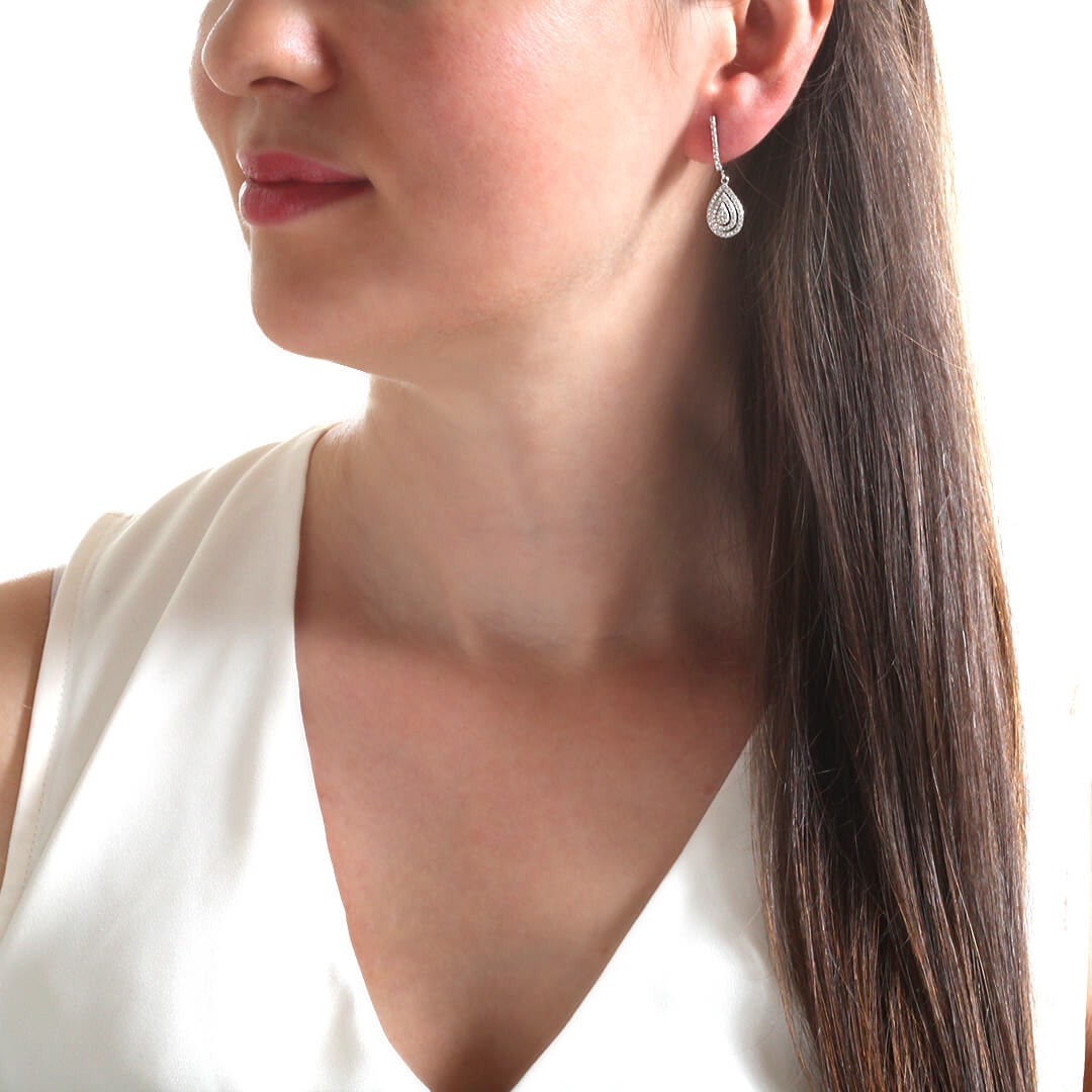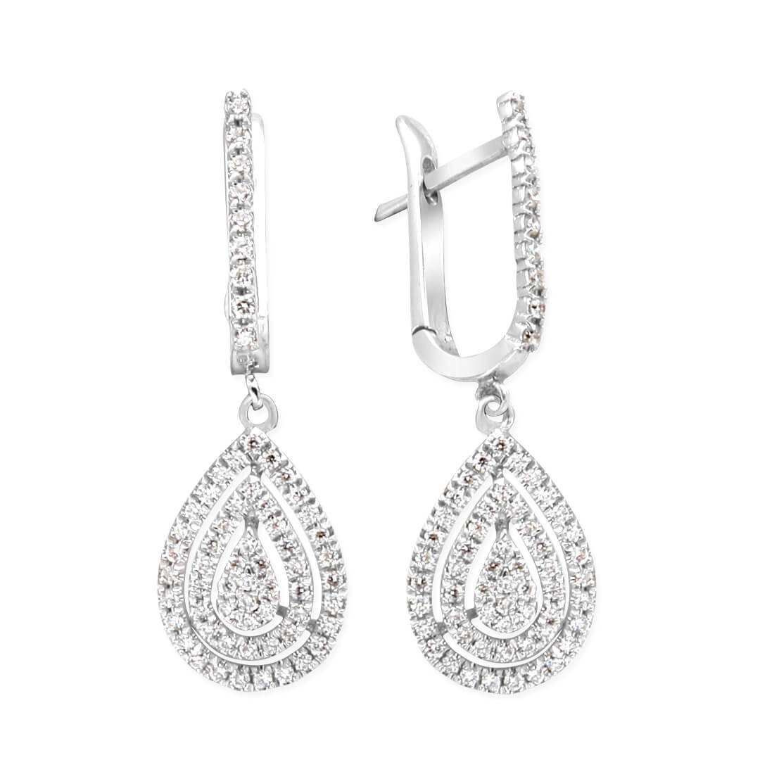 0.65 karat yuvarlak F-SI kesim pırlantalarla kombine taşlanmış el emeği, özel işçilik kalitesiyle tasarlanmış hafif sallantılı oldukça şık ve elit bir modele sahip pırlanta 14 ayar beyaz altın damla formlu küpe.