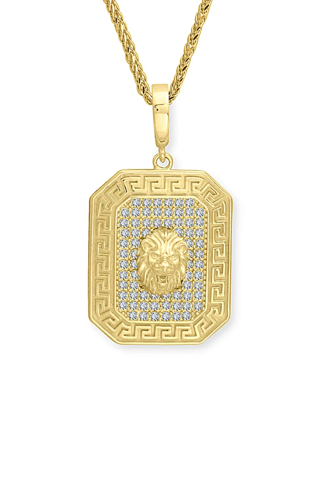 Modern Şehirli Tarz Spiga Zinciri İle Oldukça Şık Bir Modele Sahip 7.50 Gr. Ağırlığında 14 Ayar Altın Beyaz Zirkon Taşlı Dikdörtgen Aslan Model Erkek Kolye.