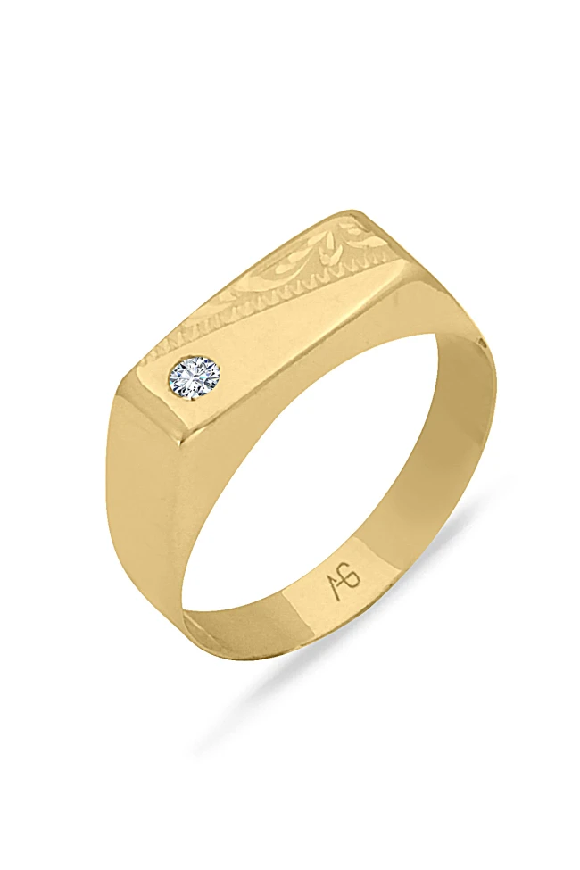 1.80 Gr. ağırlığında sarı altın özel kalem işlemeli dikdörtgen tektaş detaylı şık bir modele sahip 14 ayar altın erkek yüzük.