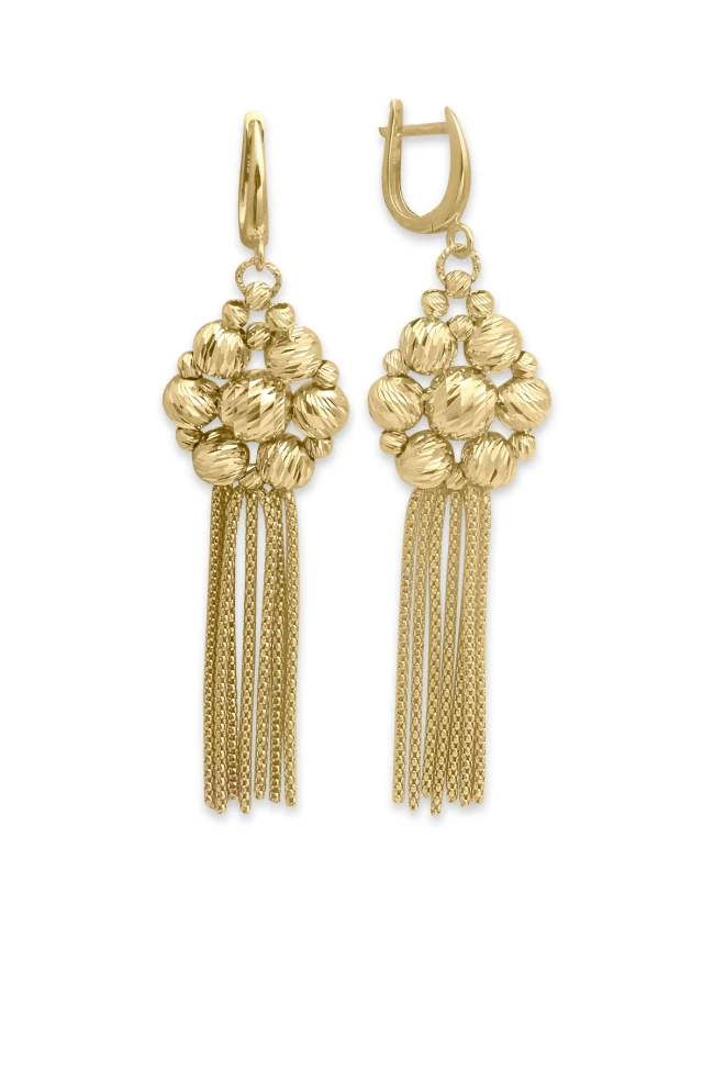 9.45 Gram Ağırlığında Çiçek Tasarım Dorika Top Detaylı Gösterişi İle Dikkatleri Üzerine Toplayan 14 Ayar Havalı Bir Modele Sahip 7.5 Cm Boyunda Altın Sallantılı Püsküllü İtalyan Küpe.