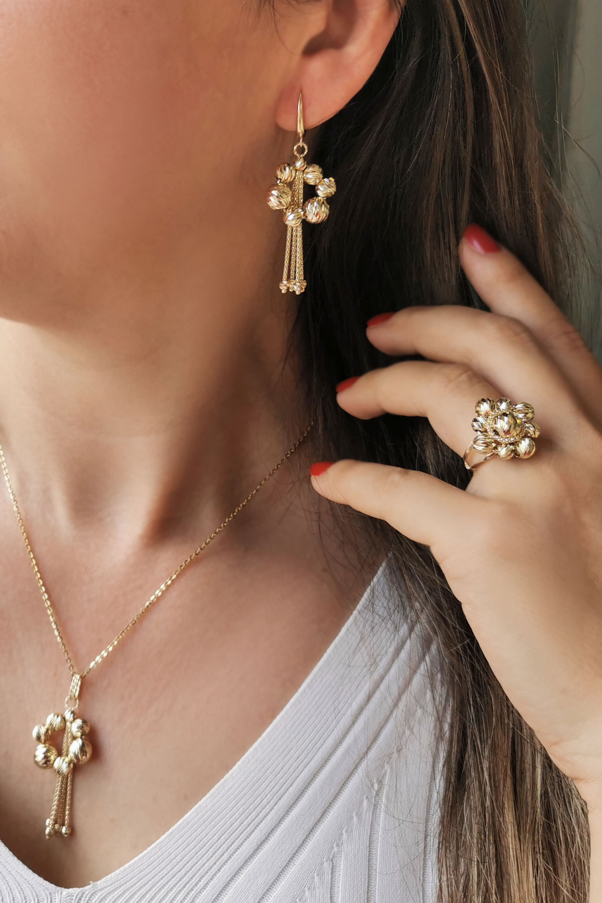 17.35 Gram Ağırlığında Dorika Toplu Gösterişi İle Dikkatleri Üzerine Toplayan 14 Ayar Modern ve Şık Bir Havaya Sahip Kolye Ve Küpesi 5 Cm Boyunda Altın Sallantılı İtalyan Kolye, Küpe, Yüzük Takım.