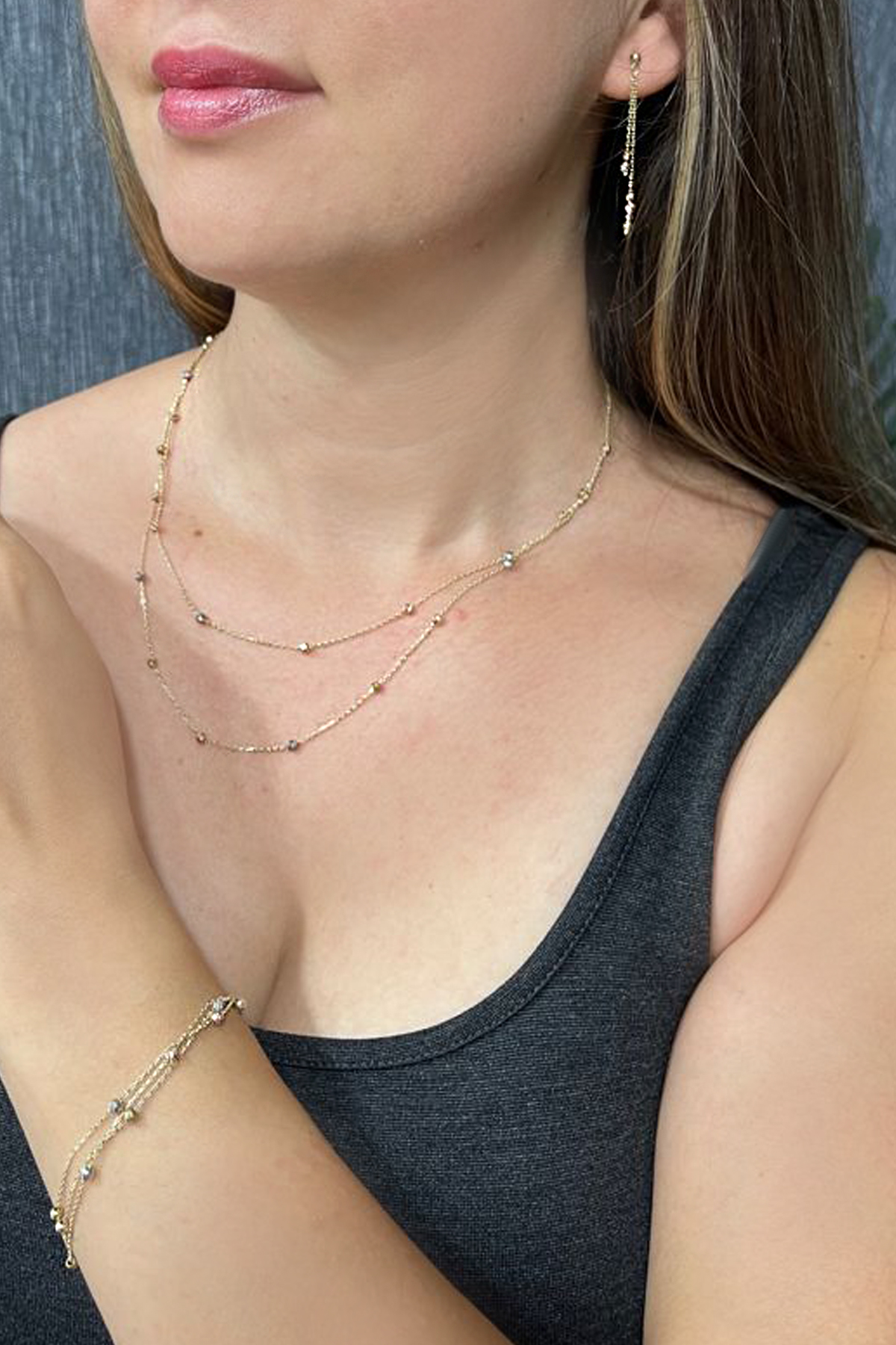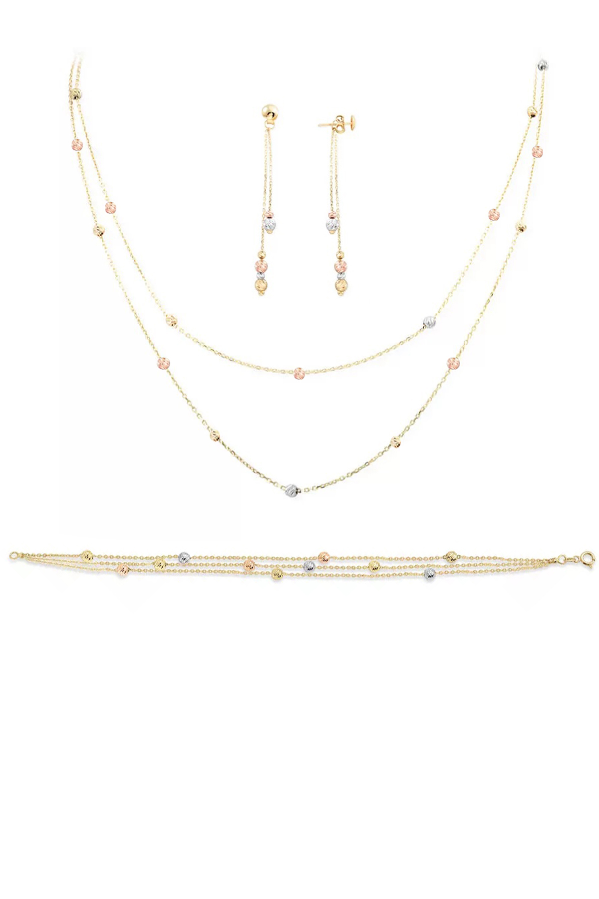 8.20 Gram Ağırlığında Kalemli Yuvarlak Serpme Toplardan Tasarlanmış Şık Bir Tarzı Olan 14 Ayar Altın Top Kolye, Küpe ve Bileklik Takımı.