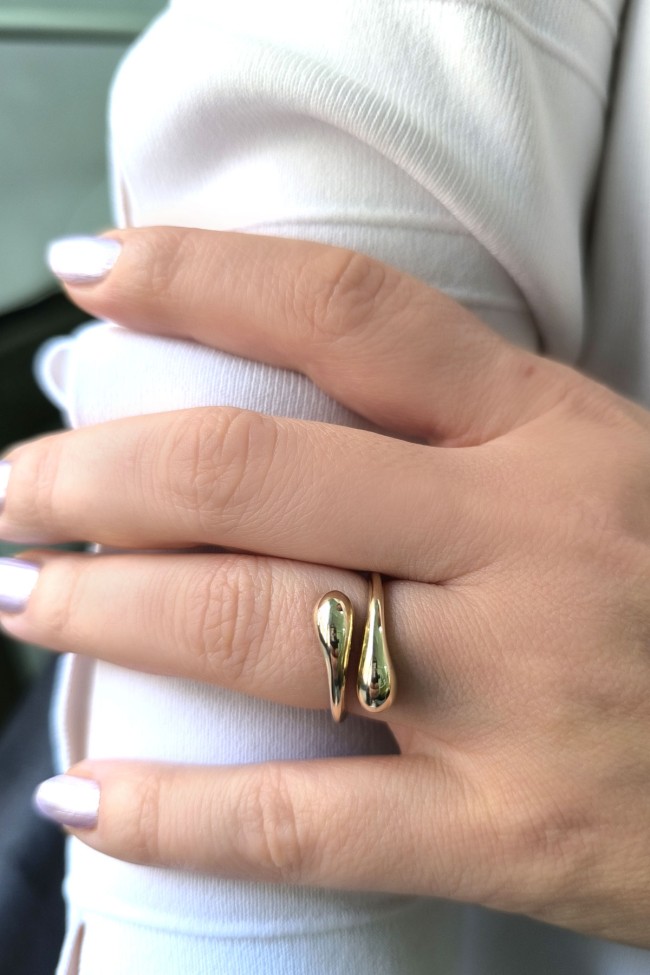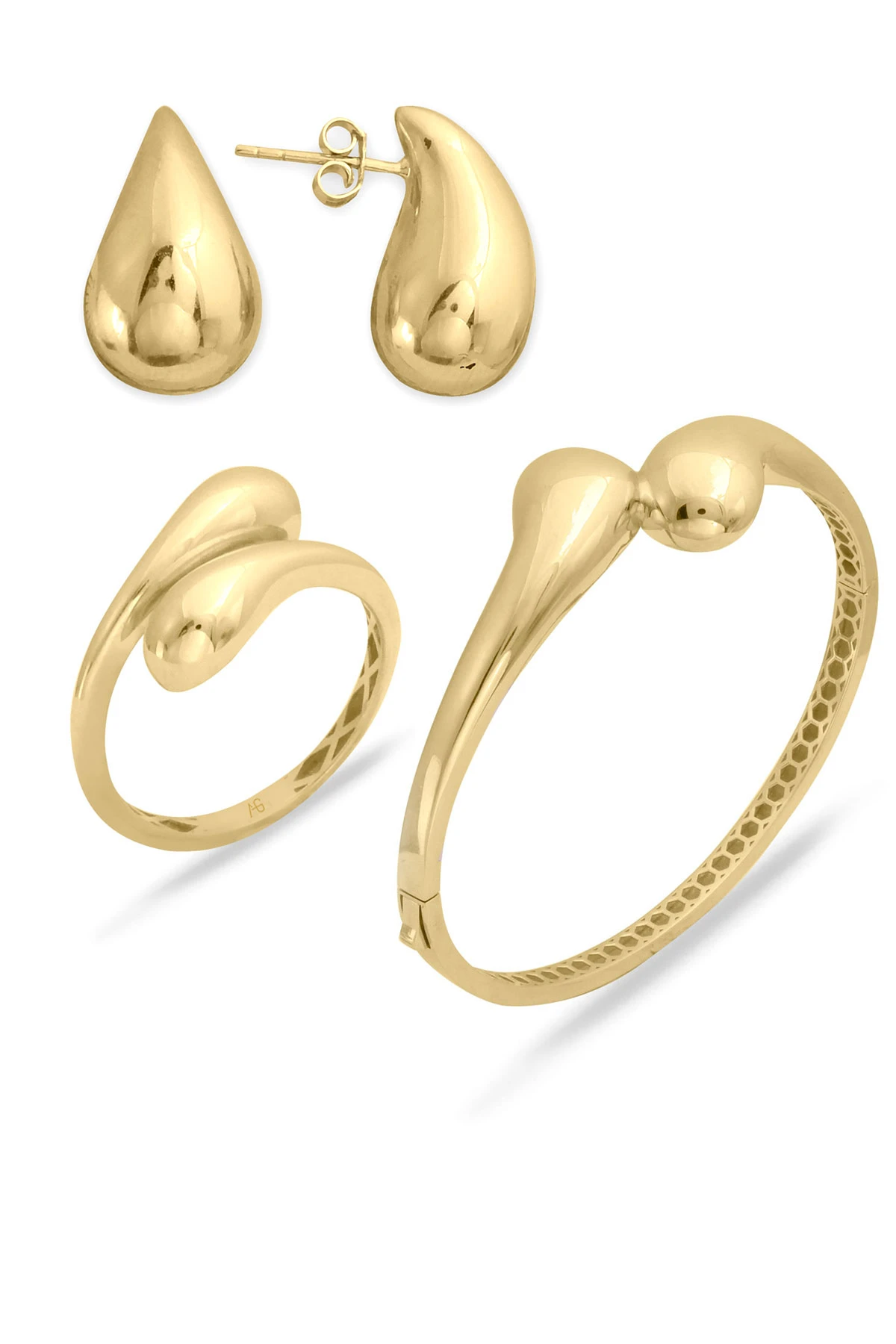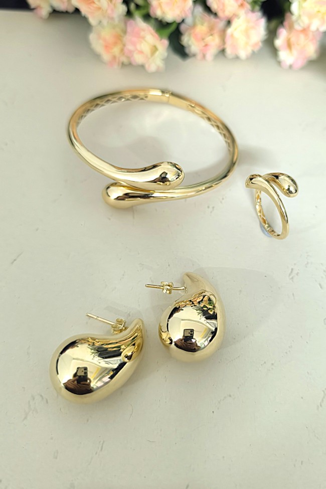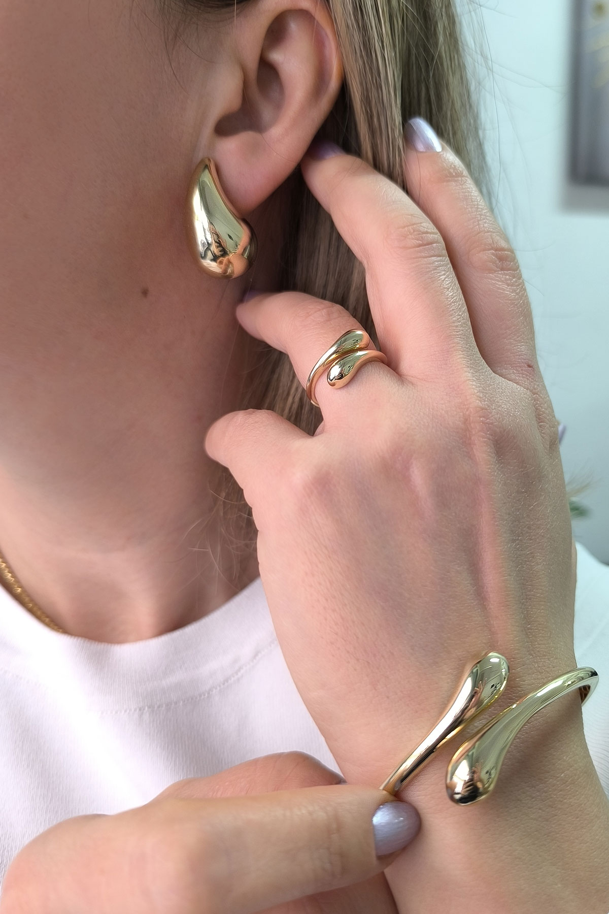 14 Ayar taşsız trend model drop damla detaylı şık tasarımı ile gösterişli ve spor duruşa sahip günlük kullanıma uygun 18.20 gram ağırlığında altın yüzük, küpe, bilezikten oluşan üçlü takım.
