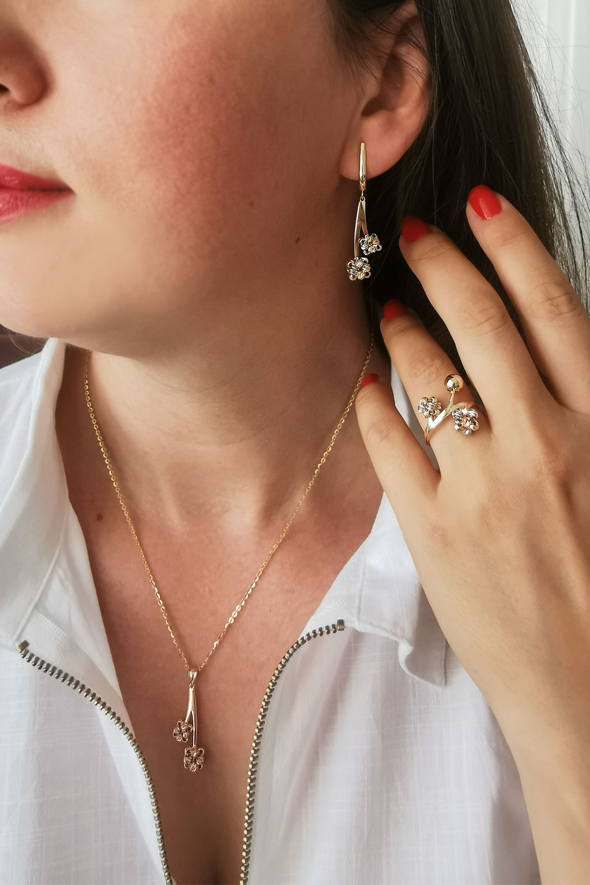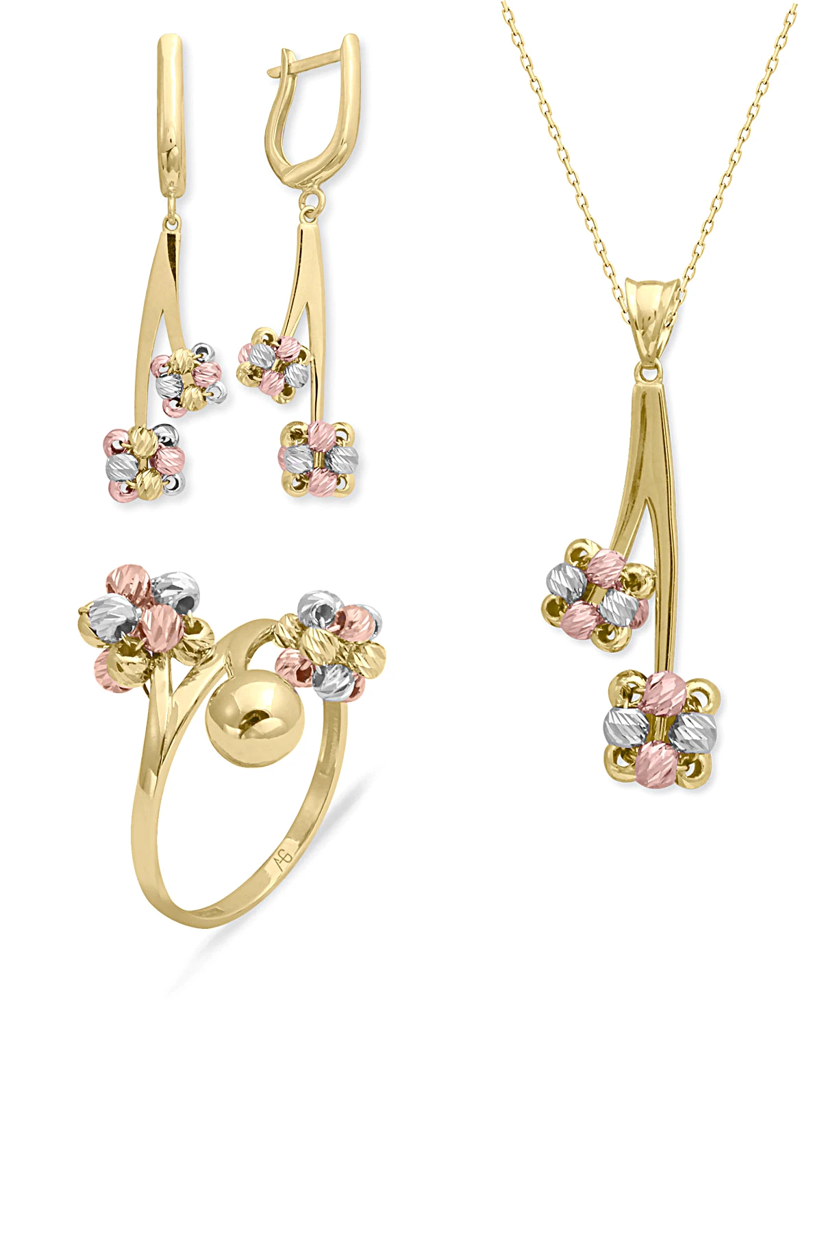 10.90 Gram Ağırlığında Toplu Filiz Tasarımıyla Oldukça Şık Ve Spor Bir Havaya Sahip 14 Ayar Altın Kombin Yüzük Kolye Küpe Üçlü Set.