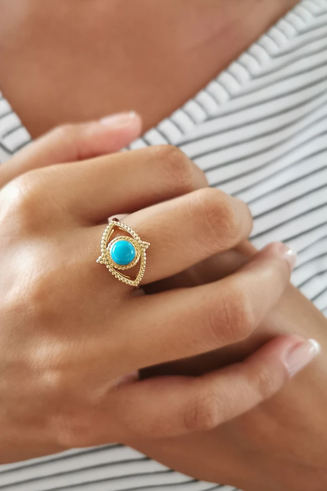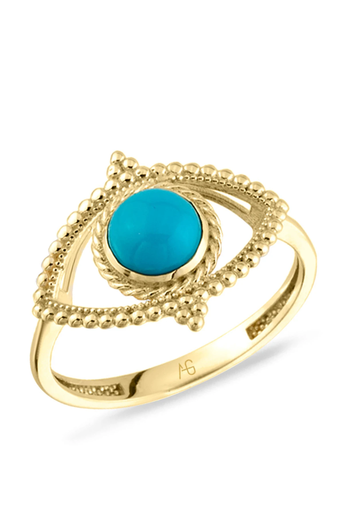 2.05 Gram Ağırlığında Firuze Taş Detayı Göz Tasarımlı Şık Bir Havaya Sahip, Farklı Spor Tarzı Olan Günlük Kullanıma Uygun 14 Ayar Altın Kadın Yüzük.