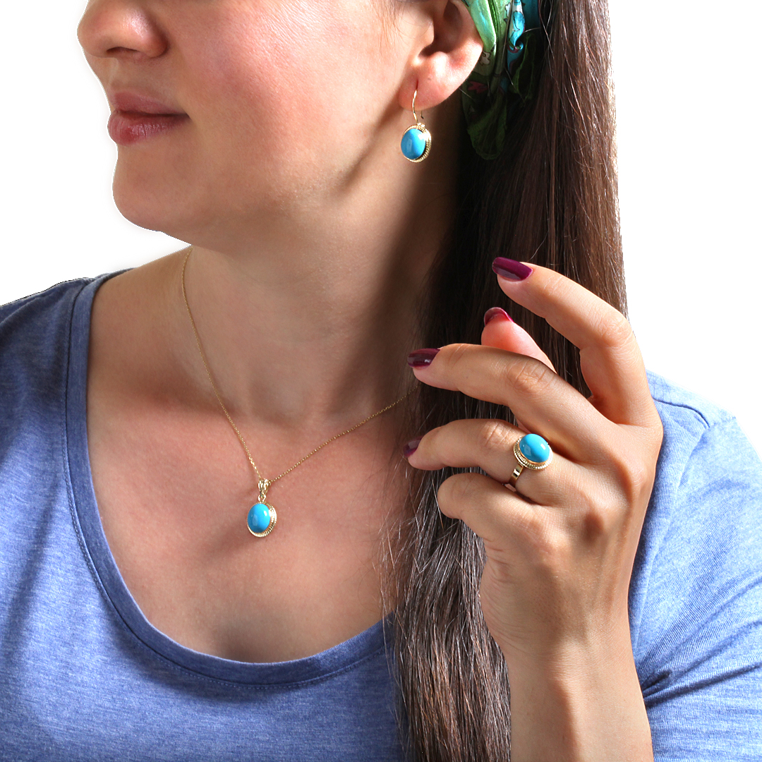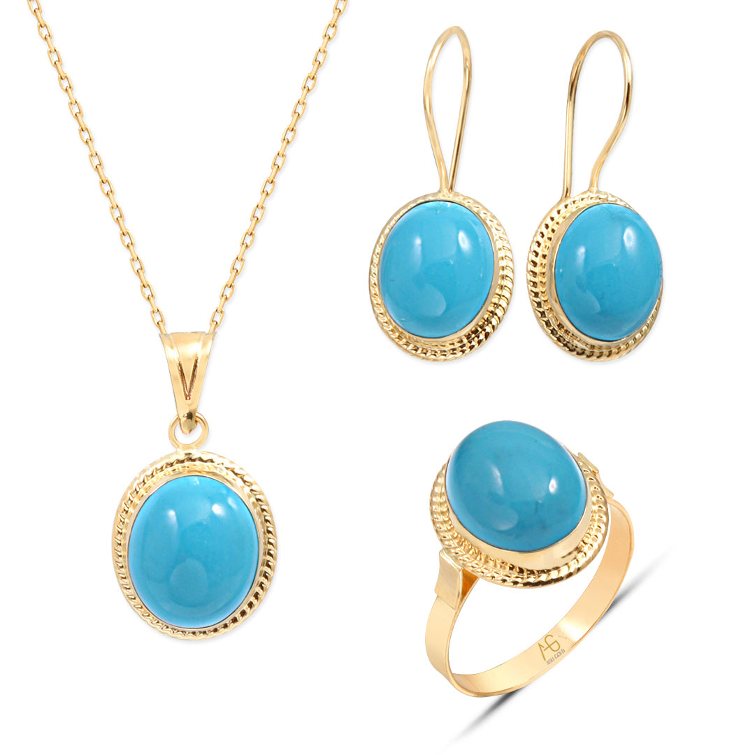 8.50 Gram 14 Ayar Altın Orta Boy Firuze Taşlı Kolye, Küpe Ve Yüzükten Oluşan Üçlü Nostalji Tasarım Takım. Kendinize yada sevdiklerinize armağan edebileceğiniz bu şık ve trend model tasarım her zaman severek kullanılacak.