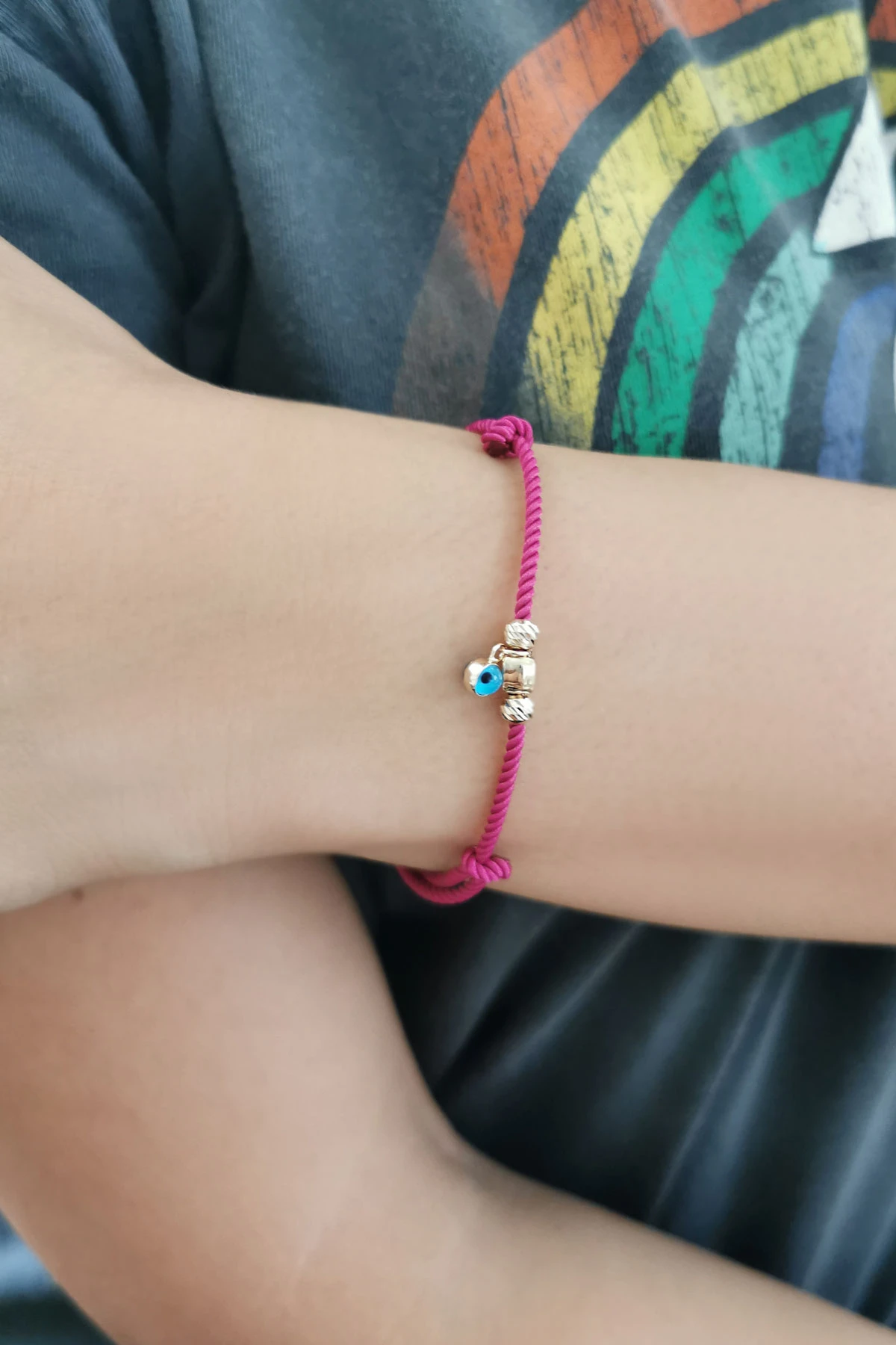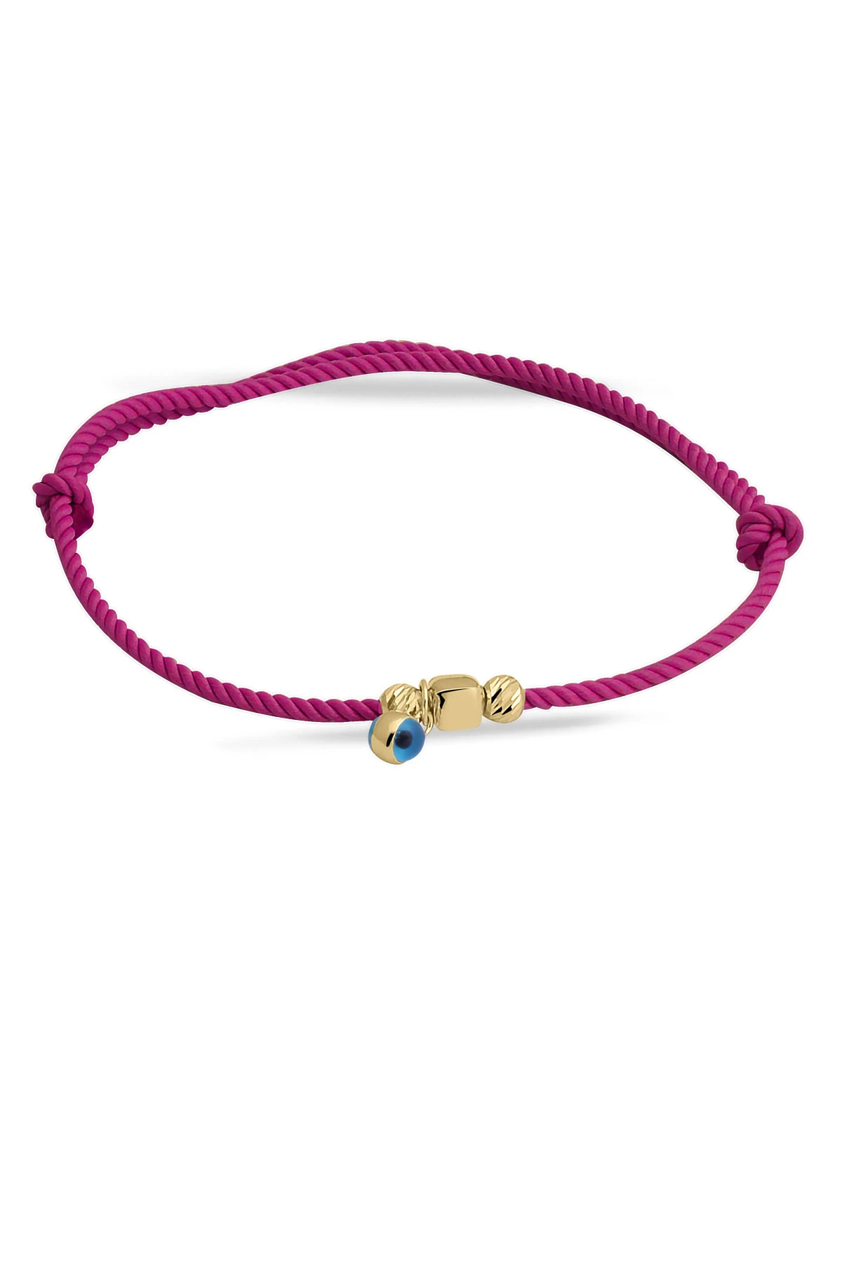 Fuşya ipli tasarımı ile günlük olarak saatlerinizle yada tek olarak kullanabileceğiniz sevdiklerinize doğum günü hediyesi olarak da armağan edebileceğiniz 14 ayar 0.65 gr ağırlığında 14 ayar altın dorika ve küp detaylı nazar bileklik.