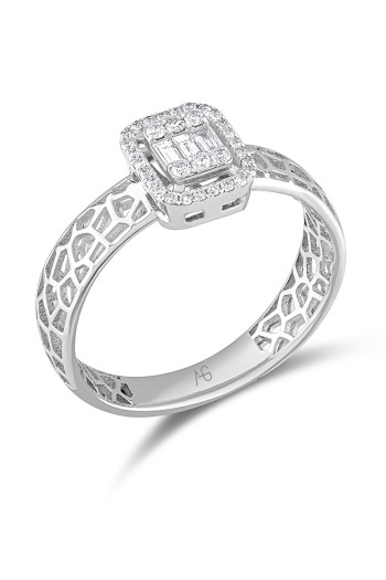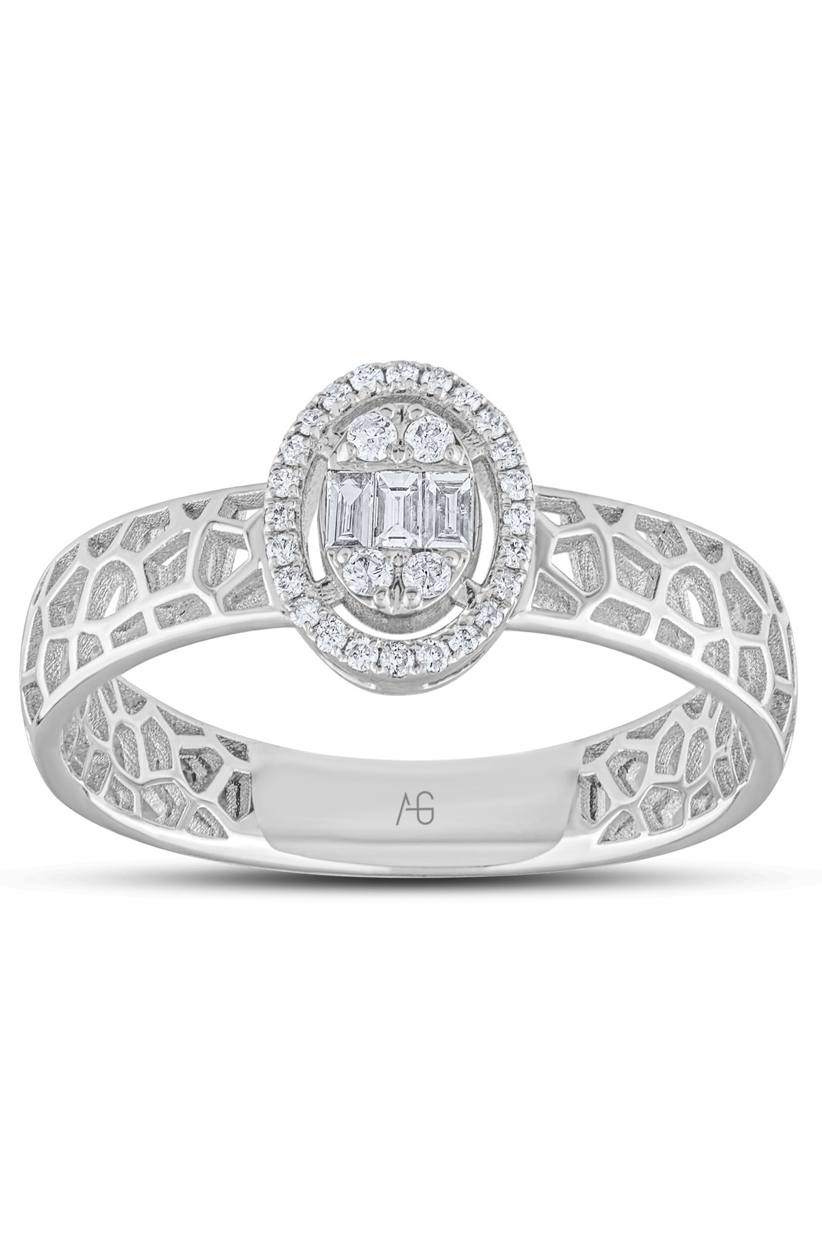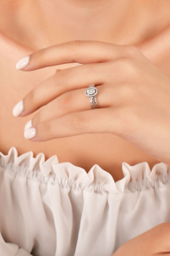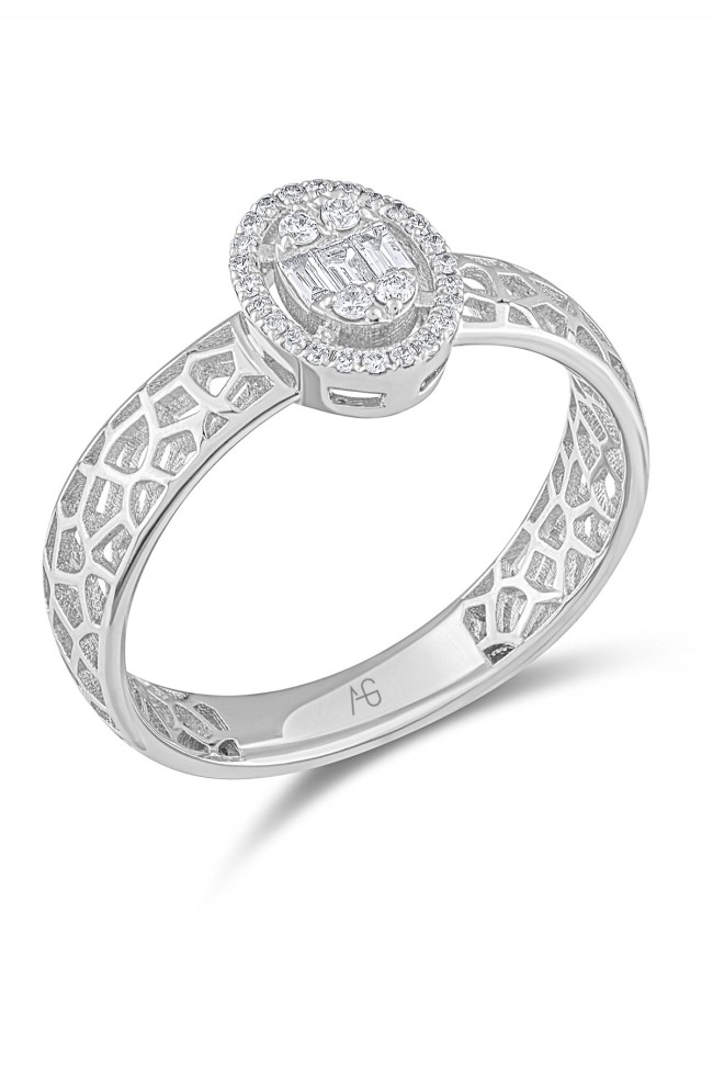 0.15 Ct. F/SI taş detaylarına sahip 14 ayar beyaz altın füzyon kol pırlanta oval yüzük.